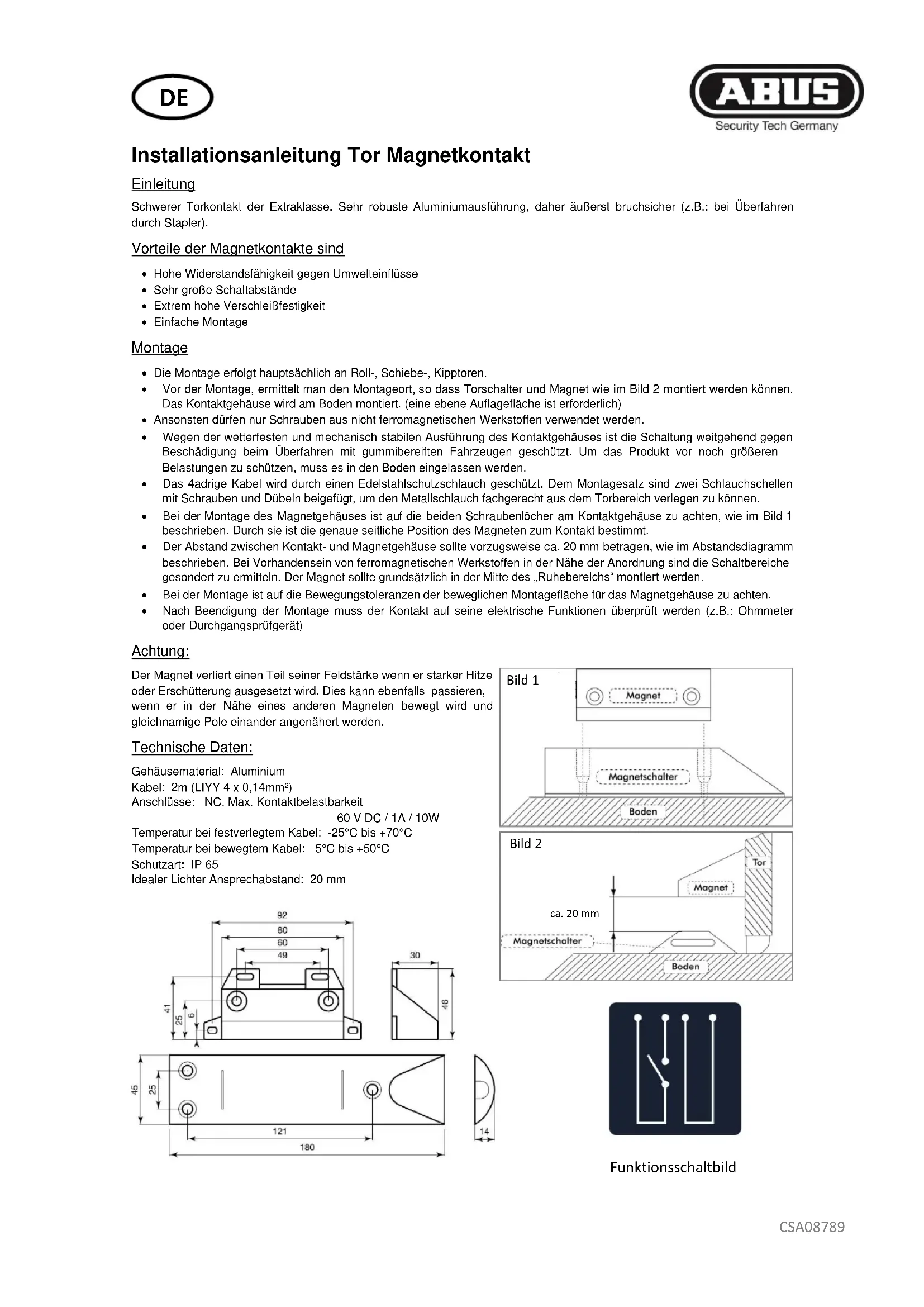Instructions d’installation Contact magnétique de porte Introduction Contact de porte lourd haut de gamme. Boîtier aluminium très solide, donc extrêmement résistant à la rupture (par ex. : au passage d’un chariot élévateur). Les avantages des contacts magnétiques sont les suivants