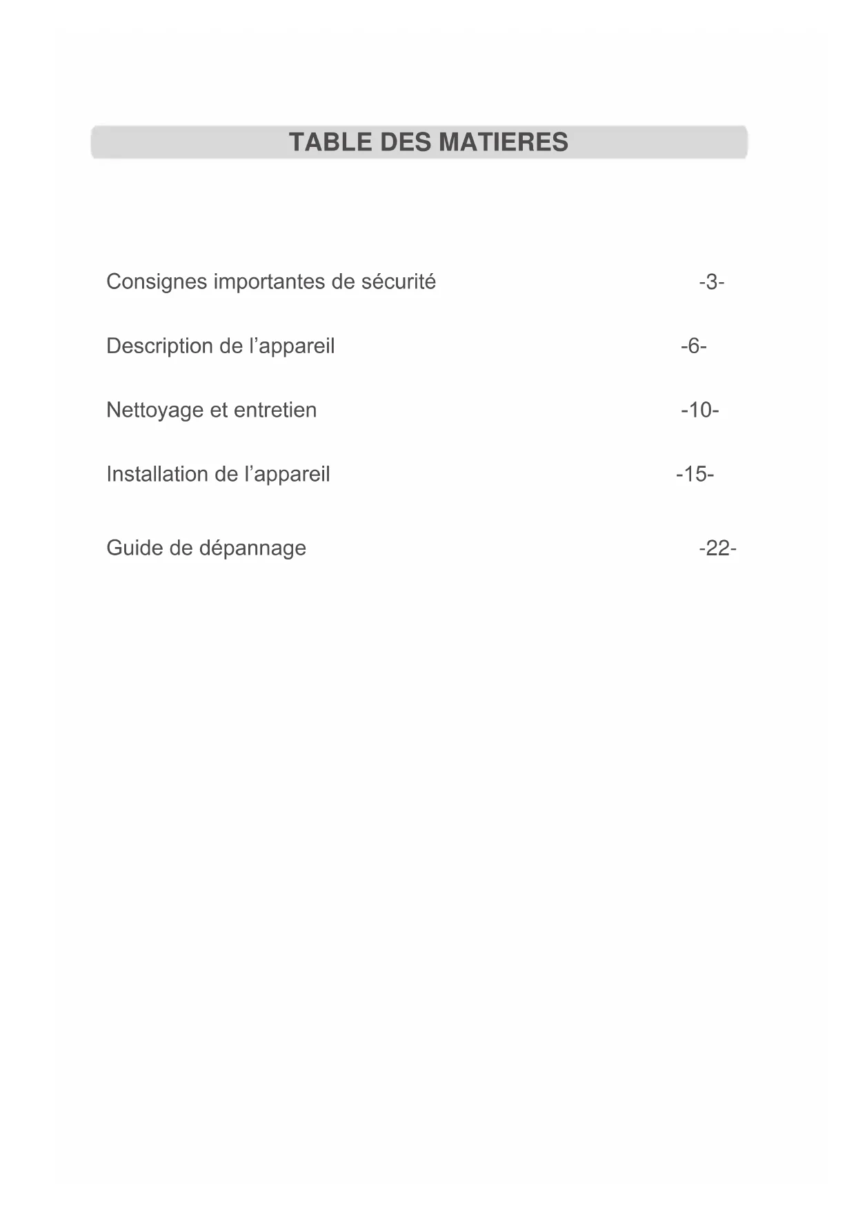 Consignes importantes de sécurité Description de l’appareil -6- Nettoyage et entretien -10- Installation de l’appareil -15- Guide de dépannage