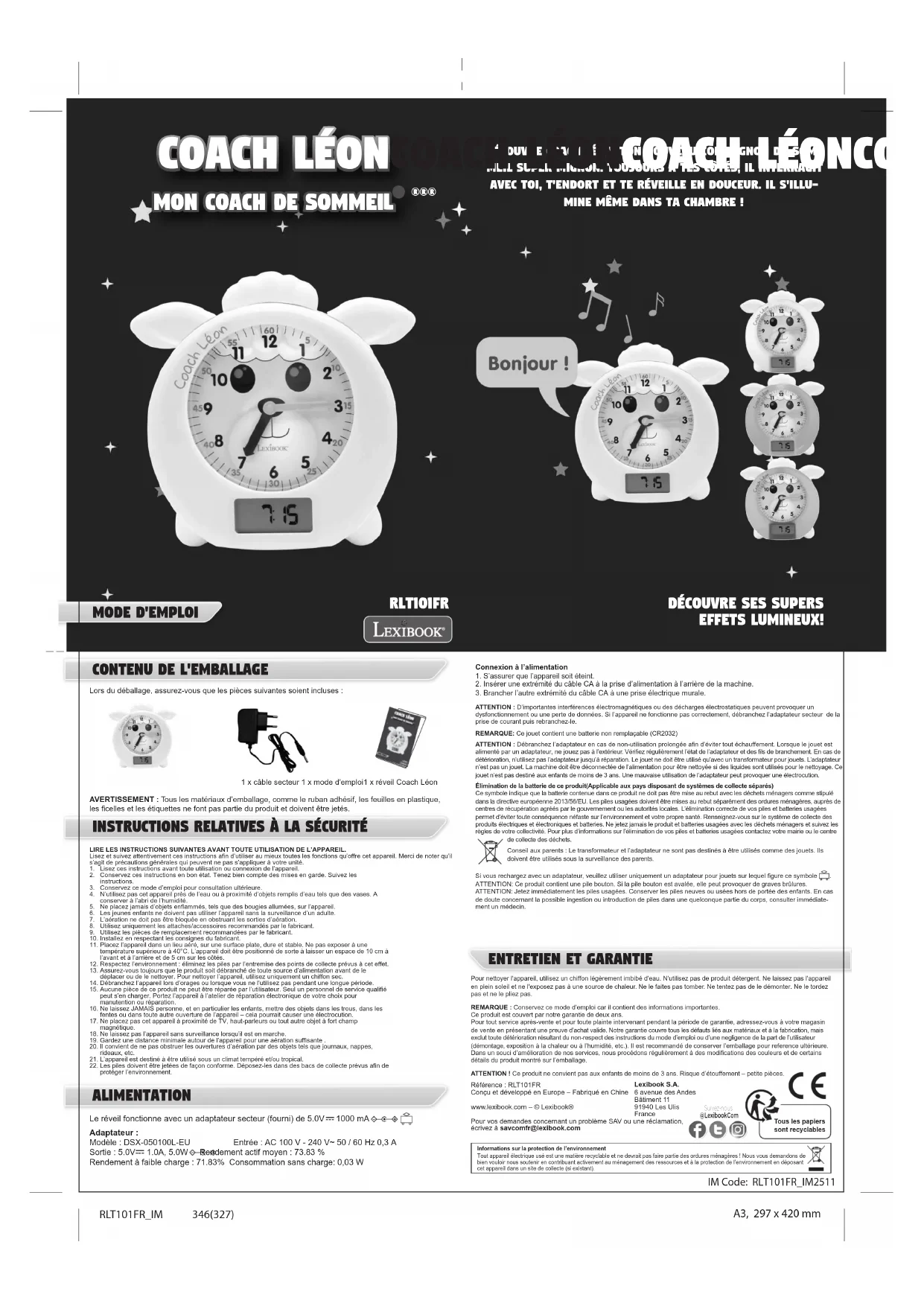 Connexion à l’alimentation1. S’assurer que l’appareil soit éteint.2. Insérer une extrémité du câble CA à la prise d’alimentation à l’arrière de la machine.3. Brancher l’autre extrémité du câble CA à une prise électrique murale. ATTENTION : D’importantes interférences électromagnétiques ou des décharges électrostatiques peuvent provoquer un dysfonctionnement ou une perte de données. Si l’appareil ne fonctionne pas correctement, débranchez l’adaptateur secteur de la prise de courant puis rebranchez-le. REMARQUE: Ce jouet contient une batterie non remplaçable (CR2032) ATTENTION : Débranchez l’adaptateur en cas de non-utilisation prolongée afin d’éviter tout échauffement. Lorsque le jouet est alimenté par un adaptateur, ne jouez pas à l’extérieur. Vérifiez régulièrement l’état de l’adaptateur et des fils de branchement. En cas de détérioration, n’utilisez pas l’adaptateur jusqu’à réparation. Le jouet ne doit être utilisé qu’avec un transformateur pour jouets. L’adaptateur n’est pas un jouet. La machine doit être déconnectée de l’alimentation pour être nettoyée si des liquides sont utilisés pour le nettoyage. Ce jouet n’est pas destiné aux enfants de moins de 3 ans. Une mauvaise utilisation de l’adaptateur peut provoquer une électrocution. Élimination de la batterie de ce produit(Applicable aux pays disposant de systèmes de collecte séparés) Ce symbole indique que la batterie contenue dans ce produit ne doit pas être mise au rebut avec les déchets ménagers comme stipulé dans la directive européenne 2013/56/EU. Les piles usagées doivent être mises au rebut séparément des ordures ménagères, auprès de centres de récupération agréés par le gouvernement ou les autorités locales. L’élimination correcte de vos piles et batteries usagées permet d’éviter toute conséquence néfaste sur l’environnement et votre propre santé. Renseignez-vous sur le système de collecte des produits électriques et électroniques et batteries. Ne jetez jamais le produit et batteries usagées avec les déchets ménagers et suivez les règles de votre collectivité. Pour plus d’informations sur l’élimination de vos piles et batteries usagées contactez votre mairie ou le centre de collecte des déchets.Conseil aux parents : Le transformateur et l’adaptateur ne sont pas destinés à être utilisés comme des jouets. Ils doivent être utilisés sous la surveillance des parents. Pour nettoyer l'appareil, utilisez un chiffon légèrement imbibé d'eau. N'utilisez pas de produit détergent. Ne laissez pas l'appareil en plein soleil et ne l'exposez pas à une source de chaleur. Ne le faites pas tomber. Ne tentez pas de le démonter. Ne le tordez pas et ne le pliez pas.REMARQUE : Conservez ce mode d’emploi car il contient des informations importantes.Ce produit est couvert par notre garantie de deux ans. Pour tout service après-vente et pour toute plainte intervenant pendant la période de garantie, adressez-vous à votre magasin de vente en présentant une preuve d’achat valide. Notre garantie couvre tous les défauts liés aux matériaux et à la fabrication, mais exclut toute détérioration résultant du non-respect des instructions du mode d’emploi ou d’une negligence de la part de l’utilisateur (démontage, exposition à la chaleur ou à l’humidité, etc.). Il est recommandé de conserver l’emballage pour reference ultérieure. Dans un souci d’amélioration de nos services, nous procédons régulièrement à des modifications des couleurs et de certains détails du produit montré sur l’emballage. ATTENTION ! Ce produit ne convient pas aux enfants de moins de 3 ans. Risque d’étouffement – petite pièces. IM Code: RLT101FR_IM2511 Informations sur la protection de l’environnement Tout appareil électrique usé est une matière recyclable et ne devrait pas faire partie des ordures ménagères ! Nous vous demandons de bien vouloir nous soutenir en contribuant activement au ménagement des ressources et à la protection de l’environnement en déposant cet appareil dans un site de collecte (si existant). Référence : RLT101FR Conçu et développé en Europe – Fabriqué en Chine www.lexibook.com – © Lexibook® Pour vos demandes concernant un problème SAV ou une réclamation, écrivez à savcomfr@lexibook.com Suivez-nous @LexibookCom Tous les papiers sont recyclables Lexibook S.A. 6 avenue des Andes Bâtiment 11 91940 Les Ulis France Si vous rechargez avec un adaptateur, veuillez utiliser uniquement un adaptateur pour jouets sur lequel figure ce symbole . ATTENTION: Ce produit contient une pile bouton. Si la pile bouton est avalée, elle peut provoquer de graves brûlures. ATTENTION: Jetez immédiatement les piles usagées. Conserver les piles neuves ou usées hors de portée des enfants. En cas de doute concernant la possible ingestion ou introduction de piles dans une quelconque partie du corps, consulter immédiate- ment un médecin. RLT101FR_IM 346(327) A3, 297 x 420 mm Découvre ses supers effets lumineux!DÉCOUVRE Coach Léon, Ton COMPAGNON DE SOMMEIL Emplacement des touches Je valide Je vais en avant