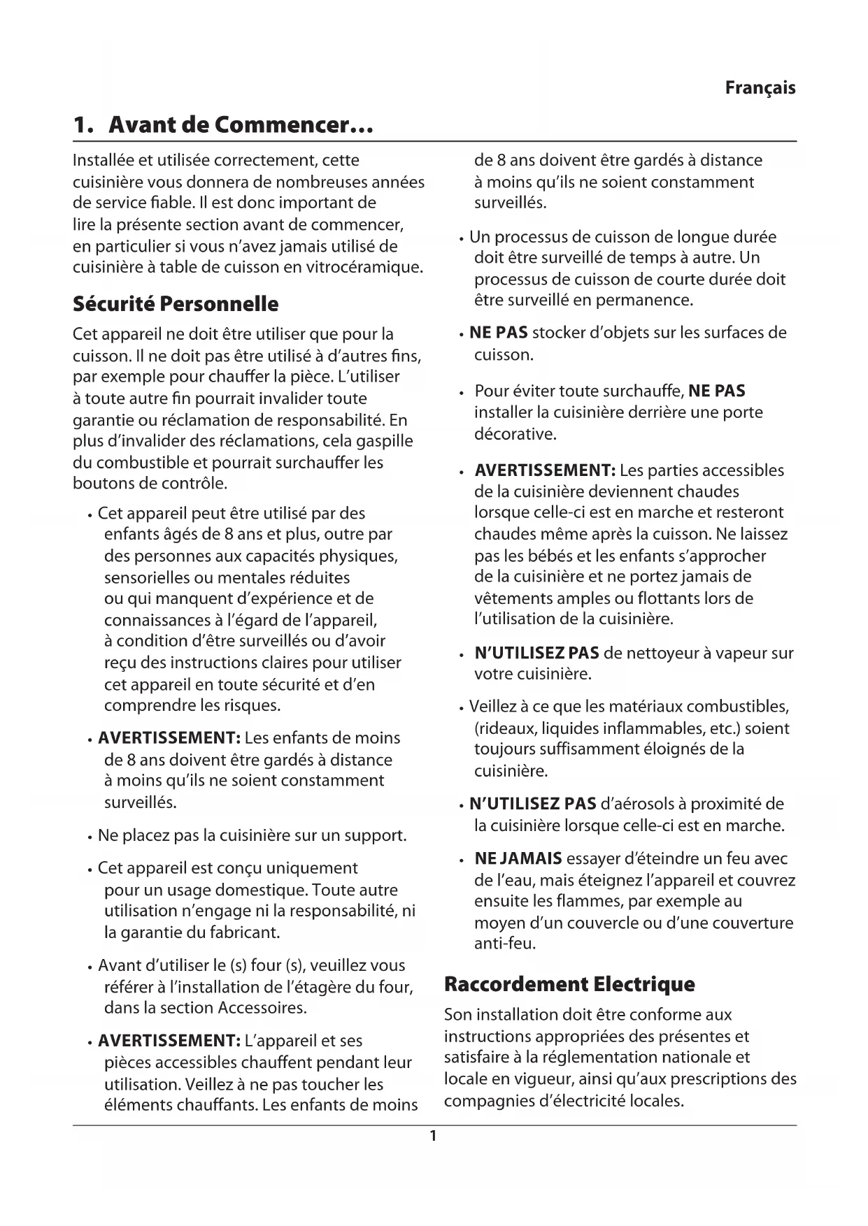 Français Installée et utilisée correctement, cette cuisinière vous donnera de nombreuses années de service able. Il est donc important de lire la présente section avant de commencer, en particulier si vous n’avez jamais utilisé de cuisinière à table de cuisson en vitrocéramique. Sécurité Personnelle Cet appareil ne doit être utiliser que pour la cuisson. Il ne doit pas être utilisé à d’autres ns, par exemple pour chauer la pièce. L’utiliser à toute autre n pourrait invalider toute garantie ou réclamation de responsabilité. En plus d’invalider des réclamations, cela gaspille du combustible et pourrait surchauer les boutons de contrôle.