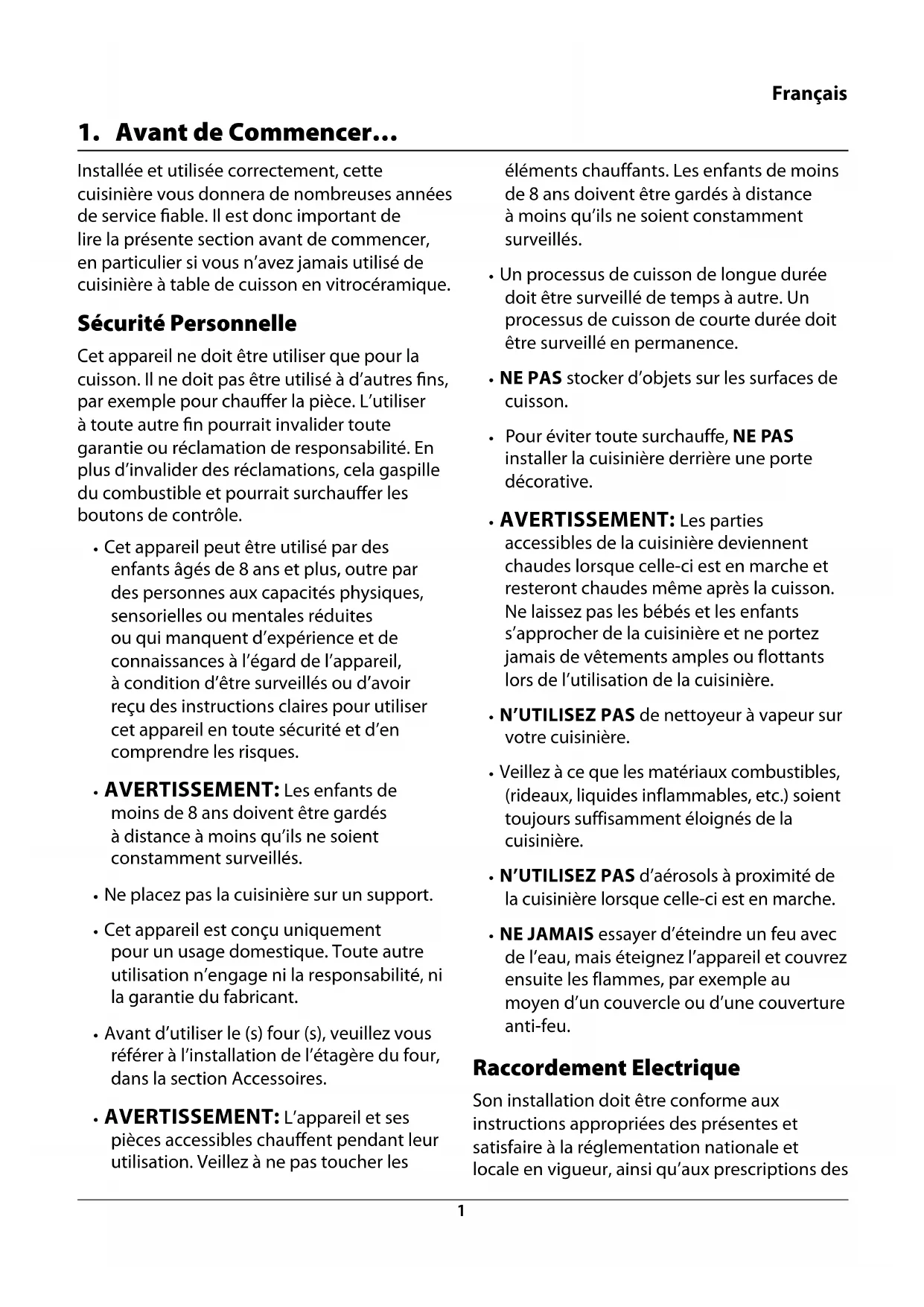 Français Installée et utilisée correctement, cette cuisinière vous donnera de nombreuses années de service able. Il est donc important de lire la présente section avant de commencer, en particulier si vous n’avez jamais utilisé de cuisinière à table de cuisson en vitrocéramique. Sécurité Personnelle Cet appareil ne doit être utiliser que pour la cuisson. Il ne doit pas être utilisé à d’autres ns, par exemple pour chauer la pièce. L’utiliser à toute autre n pourrait invalider toute garantie ou réclamation de responsabilité. En plus d’invalider des réclamations, cela gaspille du combustible et pourrait surchauer les boutons de contrôle.