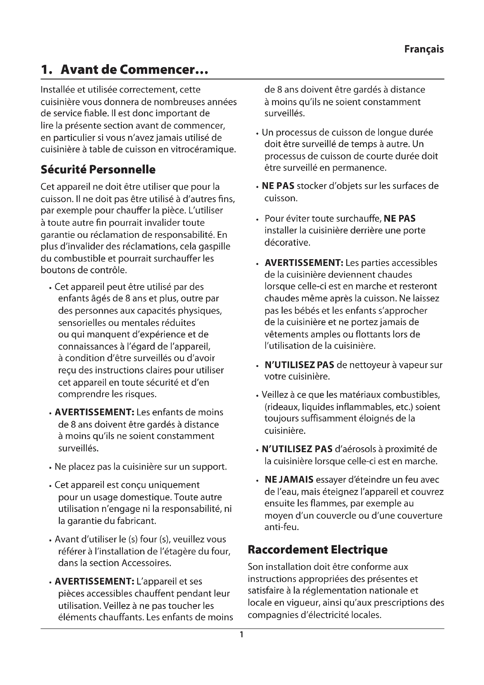 Français Installée et utilisée correctement, cette cuisinière vous donnera de nombreuses années de service able. Il est donc important de lire la présente section avant de commencer, en particulier si vous n’avez jamais utilisé de cuisinière à table de cuisson en vitrocéramique. Sécurité Personnelle Cet appareil ne doit être utiliser que pour la cuisson. Il ne doit pas être utilisé à d’autres ns, par exemple pour chauer la pièce. L’utiliser à toute autre n pourrait invalider toute garantie ou réclamation de responsabilité. En plus d’invalider des réclamations, cela gaspille du combustible et pourrait surchauer les boutons de contrôle.