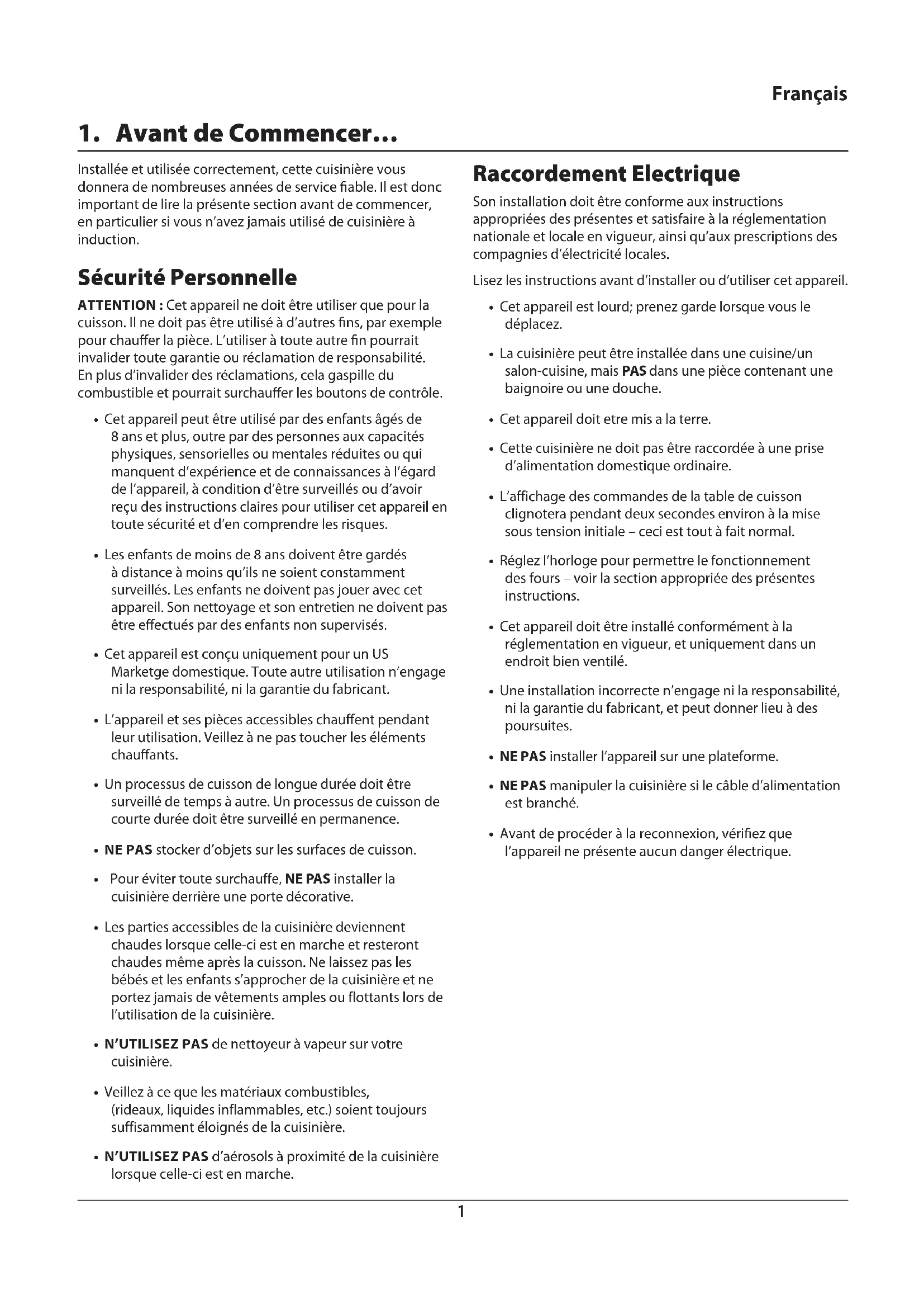 Table des Matièresii1 Français Installée et utilisée correctement, cette cuisinière vous donnera de nombreuses années de service able. Il est donc important de lire la présente section avant de commencer, en particulier si vous n’avez jamais utilisé de cuisinière à induction. Sécurité Personnelle ATTENTION : Cet appareil ne doit être utiliser que pour la cuisson. Il ne doit pas être utilisé à d’autres ns, par exemple pour chauer la pièce. L’utiliser à toute autre n pourrait invalider toute garantie ou réclamation de responsabilité. En plus d’invalider des réclamations, cela gaspille du combustible et pourrait surchauer les boutons de contrôle.