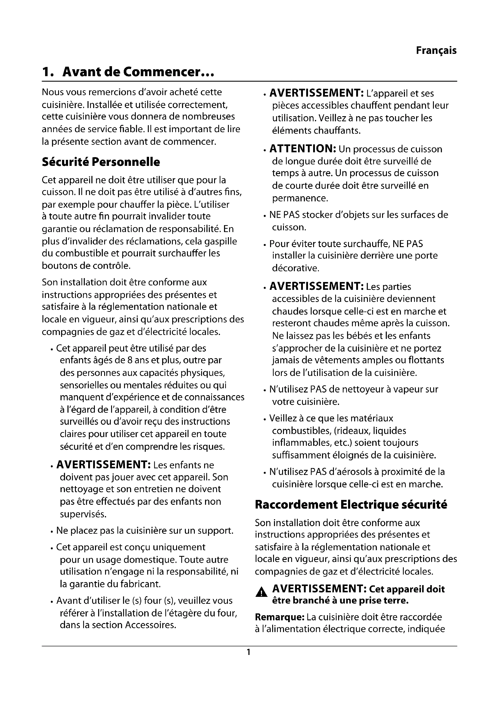 Français Nous vous remercions d’avoir acheté cette cuisinière. Installée et utilisée correctement, cette cuisinière vous donnera de nombreuses années de service able. Il est important de lire la présente section avant de commencer. Sécurité Personnelle Cet appareil ne doit être utiliser que pour la cuisson. Il ne doit pas être utilisé à d’autres ns, par exemple pour chauer la pièce. L’utiliser à toute autre n pourrait invalider toute garantie ou réclamation de responsabilité. En plus d’invalider des réclamations, cela gaspille du combustible et pourrait surchauer les boutons de contrôle.Son installation doit être conforme aux instructions appropriées des présentes et satisfaire à la réglementation nationale et locale en vigueur, ainsi qu’aux prescriptions des compagnies de gaz et d’électricité locales.• Cet appareil peut être utilisé par des enfants âgés de 8 ans et plus, outre par des personnes aux capacités physiques, sensorielles ou mentales réduites ou qui manquent d’expérience et de connaissances à l’égard de l’appareil, à condition d’être surveillés ou d’avoir reçu des instructions claires pour utiliser cet appareil en toute sécurité et d’en comprendre les risques.• AVERTISSEMENT: Les enfants ne doivent pas jouer avec cet appareil. Son nettoyage et son entretien ne doivent pas être effectués par des enfants non supervisés.• Ne placez pas la cuisinière sur un support.• Cet appareil est conçu uniquement pour un usage domestique. Toute autre utilisation n’engage ni la responsabilité, ni la garantie du fabricant.• Avant d’utiliser le (s) four (s), veuillez vous référer à l’installation de l’étagère du four, dans la section Accessoires.• AVERTISSEMENT: L’appareil et ses pièces accessibles chauffent pendant leur utilisation. Veillez à ne pas toucher les éléments chauffants.• ATTENTION: Un processus de cuisson de longue durée doit être surveillé de temps à autre. Un processus de cuisson de courte durée doit être surveillé en permanence.• NE PAS stocker d’objets sur les surfaces de cuisson.• Pour éviter toute surchauffe, NE PAS installer la cuisinière derrière une porte décorative.• AVERTISSEMENT: Les parties accessibles de la cuisinière deviennent chaudes lorsque celle-ci est en marche et resteront chaudes même après la cuisson. Ne laissez pas les bébés et les enfants s’approcher de la cuisinière et ne portez jamais de vêtements amples ou flottants lors de l’utilisation de la cuisinière.• N’utilisez PAS de nettoyeur à vapeur sur votre cuisinière.• Veillez à ce que les matériaux combustibles, (rideaux, liquides inflammables, etc.) soient toujours suffisamment éloignés de la cuisinière.• N’utilisez PAS d’aérosols à proximité de la cuisinière lorsque celle-ci est en marche. Raccordement Electrique sécurité Son installation doit être conforme aux instructions appropriées des présentes et satisfaire à la réglementation nationale et locale en vigueur, ainsi qu’aux prescriptions des compagnies de gaz et d’électricité locales.