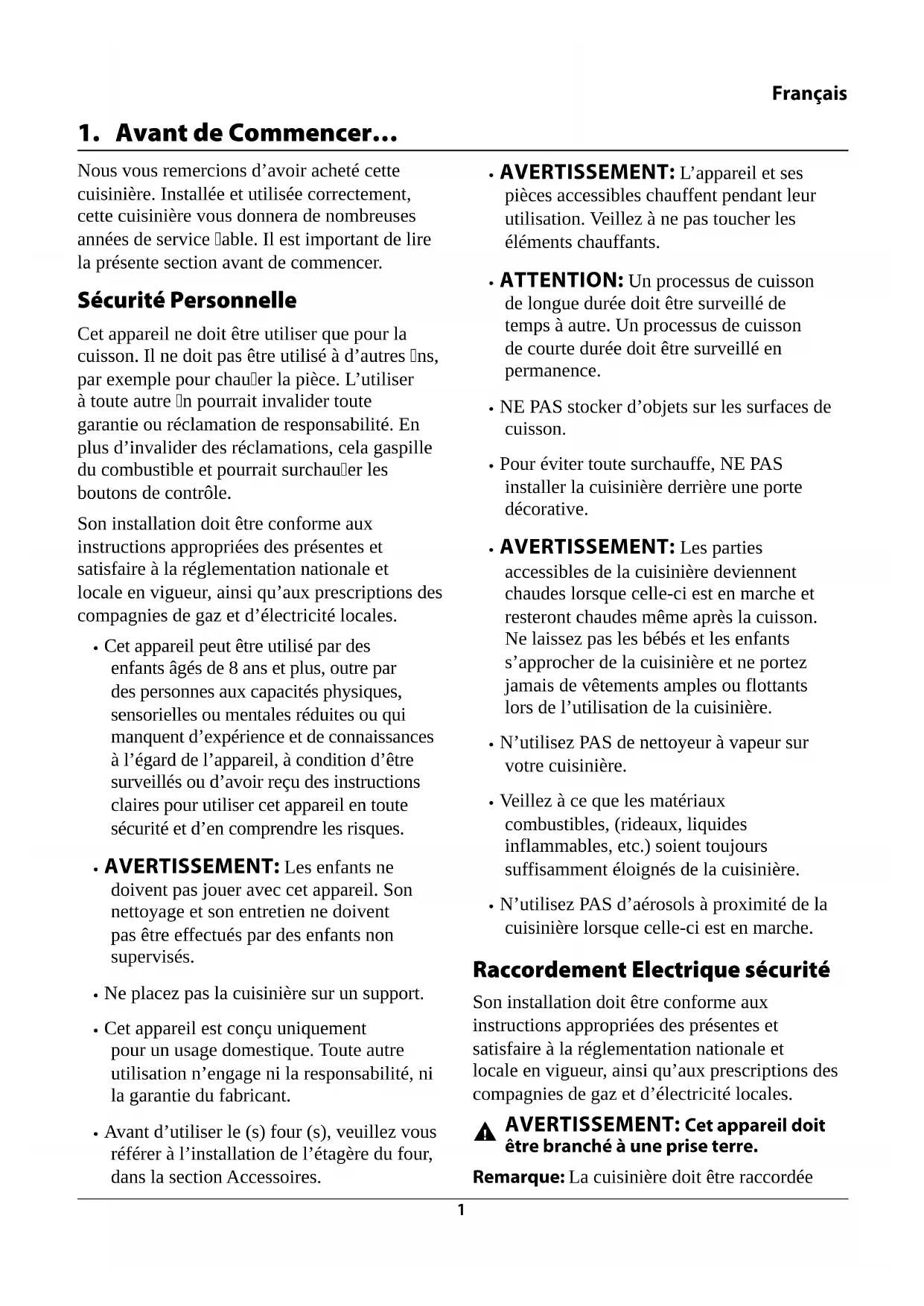 Français1 Français Nous vous remercions d’avoir acheté cette cuisinière. Installée et utilisée correctement, cette cuisinière vous donnera de nombreuses années de service able. Il est important de lire la présente section avant de commencer. Sécurité Personnelle Cet appareil ne doit être utiliser que pour la cuisson. Il ne doit pas être utilisé à d’autres ns, par exemple pour chauer la pièce. L’utiliser à toute autre n pourrait invalider toute garantie ou réclamation de responsabilité. En plus d’invalider des réclamations, cela gaspille du combustible et pourrait surchauer les boutons de contrôle.Son installation doit être conforme aux instructions appropriées des présentes et satisfaire à la réglementation nationale et locale en vigueur, ainsi qu’aux prescriptions des compagnies de gaz et d’électricité locales.• Cet appareil peut être utilisé par des enfants âgés de 8 ans et plus, outre par des personnes aux capacités physiques, sensorielles ou mentales réduites ou qui manquent d’expérience et de connaissances à l’égard de l’appareil, à condition d’être surveillés ou d’avoir reçu des instructions claires pour utiliser cet appareil en toute sécurité et d’en comprendre les risques.• AVERTISSEMENT: Les enfants ne doivent pas jouer avec cet appareil. Son nettoyage et son entretien ne doivent pas être effectués par des enfants non supervisés.• Ne placez pas la cuisinière sur un support.• Cet appareil est conçu uniquement pour un usage domestique. Toute autre utilisation n’engage ni la responsabilité, ni la garantie du fabricant.• Avant d’utiliser le (s) four (s), veuillez vous référer à l’installation de l’étagère du four, dans la section Accessoires.• AVERTISSEMENT: L’appareil et ses pièces accessibles chauffent pendant leur utilisation. Veillez à ne pas toucher les éléments chauffants.• ATTENTION: Un processus de cuisson de longue durée doit être surveillé de temps à autre. Un processus de cuisson de courte durée doit être surveillé en permanence.• NE PAS stocker d’objets sur les surfaces de cuisson.• Pour éviter toute surchauffe, NE PAS installer la cuisinière derrière une porte décorative.• AVERTISSEMENT: Les parties accessibles de la cuisinière deviennent chaudes lorsque celle-ci est en marche et resteront chaudes même après la cuisson. Ne laissez pas les bébés et les enfants s’approcher de la cuisinière et ne portez jamais de vêtements amples ou flottants lors de l’utilisation de la cuisinière.• N’utilisez PAS de nettoyeur à vapeur sur votre cuisinière.• Veillez à ce que les matériaux combustibles, (rideaux, liquides inflammables, etc.) soient toujours suffisamment éloignés de la cuisinière.• N’utilisez PAS d’aérosols à proximité de la cuisinière lorsque celle-ci est en marche. Raccordement Electrique sécurité Son installation doit être conforme aux instructions appropriées des présentes et satisfaire à la réglementation nationale et locale en vigueur, ainsi qu’aux prescriptions des compagnies de gaz et d’électricité locales.