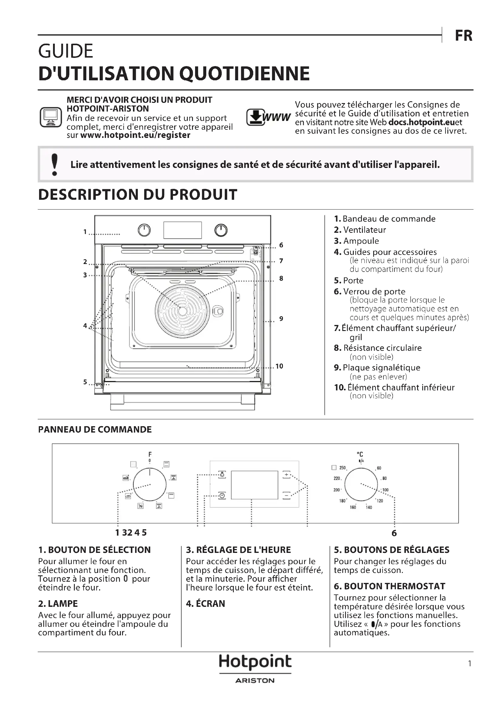 GUIDE D'UTILISATION QUOTIDIENNE Lire attentivement les consignes de santé et de sécurité avant d'utiliser l'appareil. MERCI D'AVOIR CHOISI UN PRODUIT HOTPOINT-ARISTONAfin de recevoir un service et un support complet, merci d'enregistrer votre appareil sur www. hotpoint. eu/ register WWW Vous pouvez télécharger les Consignes de sécurité et le Guide d'utilisation et entretien en visitant notre site Web docs. hotpoint.eu et en suivant les consignes au dos de ce livret.2 CONVECTION NATURELLE Pour cuire tout type de plat sur une seule grille.