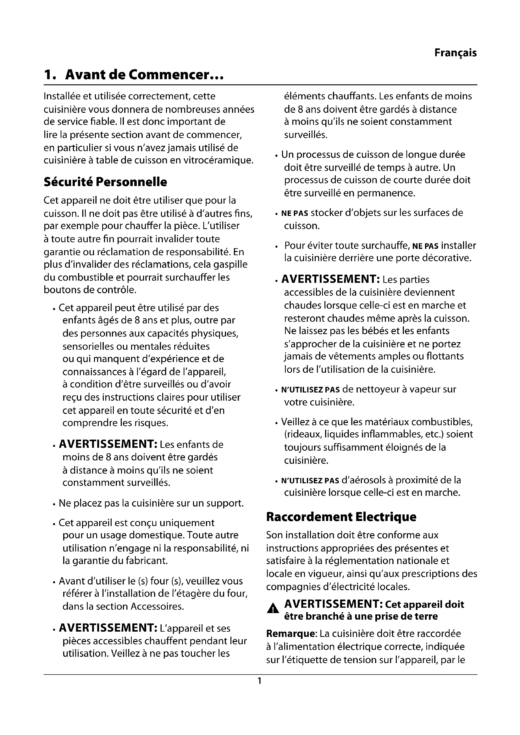 Table des Matièresii1 Français Installée et utilisée correctement, cette cuisinière vous donnera de nombreuses années de service able. Il est donc important de lire la présente section avant de commencer, en particulier si vous n’avez jamais utilisé de cuisinière à table de cuisson en vitrocéramique. Sécurité Personnelle Cet appareil ne doit être utiliser que pour la cuisson. Il ne doit pas être utilisé à d’autres ns, par exemple pour chauer la pièce. L’utiliser à toute autre n pourrait invalider toute garantie ou réclamation de responsabilité. En plus d’invalider des réclamations, cela gaspille du combustible et pourrait surchauer les boutons de contrôle.• Cet appareil peut être utilisé par des enfants âgés de 8 ans et plus, outre par des personnes aux capacités physiques, sensorielles ou mentales réduites ou qui manquent d’expérience et de connaissances à l’égard de l’appareil, à condition d’être surveillés ou d’avoir reçu des instructions claires pour utiliser cet appareil en toute sécurité et d’en comprendre les risques.• AVERTISSEMENT: Les enfants de moins de 8 ans doivent être gardés à distance à moins qu’ils ne soient constamment surveillés.• Ne placez pas la cuisinière sur un support.• Cet appareil est conçu uniquement pour un usage domestique. Toute autre utilisation n’engage ni la responsabilité, ni la garantie du fabricant.• Avant d’utiliser le (s) four (s), veuillez vous référer à l’installation de l’étagère du four, dans la section Accessoires.• AVERTISSEMENT: L’appareil et ses pièces accessibles chauffent pendant leur utilisation. Veillez à ne pas toucher les éléments chauffants. Les enfants de moins de 8 ans doivent être gardés à distance à moins qu’ils ne soient constamment surveillés.• Un processus de cuisson de longue durée doit être surveillé de temps à autre. Un processus de cuisson de courte durée doit être surveillé en permanence.• NE PAS stocker d’objets sur les surfaces de cuisson.