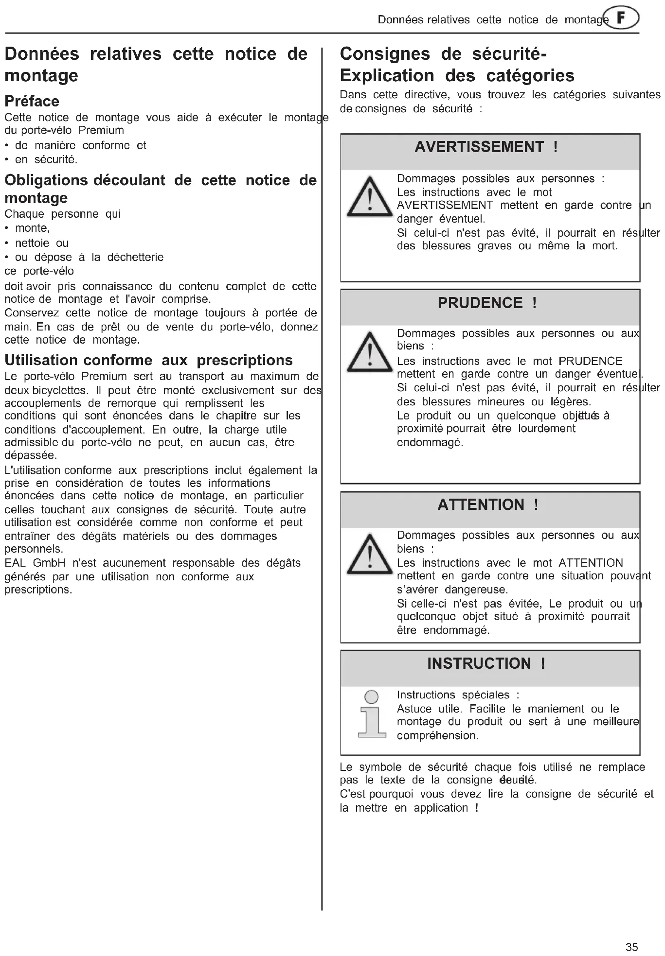 - ou dépose à la déchetterie ce porte-vélo doit avoir pris connaissance du contenu complet de cette notice de montage et l'avoir comprise. Conservez cette notice de montage toujours à portée de main. En cas de prêt ou de vente du porte-vélo, donnez cette notice de montage. Utilisation conforme aux prescriptions Le porte-vélo Premium sert au transport au maximum de deux bicyclettes. Il peut être monté exclusivement sur des accouplements de remorque qui remplissent les conditions qui sont énoncées dans le chapitre sur les conditions d'accouplement. En outre, la charge utile admissible du porte-vélo ne peut, en aucun cas, être dépassée. L'utilisation conforme aux prescriptions inclut également la prise en considération de toutes les informations énoncées dans cette notice de montage, en particulier