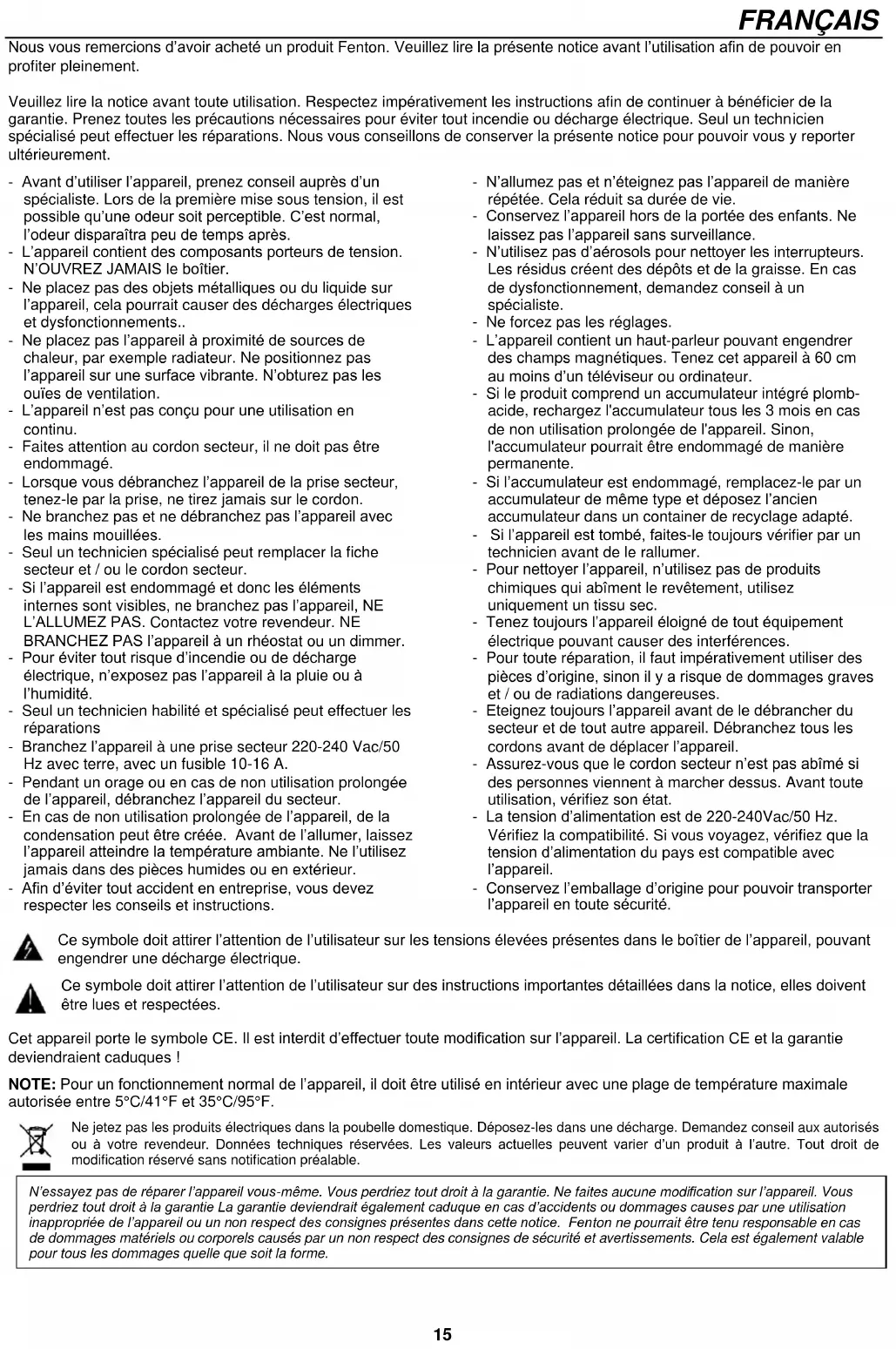 Si se requiere contraseña, puede ingresar "0000". Atención: La distancia BT es de aprox. 10 metros sin barrera.15 FRANÇAIS Nous vous remercions d’avoir acheté un produit Fenton. Veuillez lire la présente notice avant l’utilisation afin de pouvoir en profiter pleinement. Veuillez lire la notice avant toute utilisation. Respectez impérativement les instructions afin de continuer à bénéficier de la garantie. Prenez toutes les précautions nécessaires pour éviter tout incendie ou décharge électrique. Seul un technicien spécialisé peut effectuer les réparations. Nous vous conseillons de conserver la présente notice pour pouvoir vous y reporter ultérieurement. - Avant d’utiliser l’appareil, prenez conseil auprès d’un spécialiste. Lors de la première mise sous tension, il est possible qu’une odeur soit perceptible. C’est normal, l’odeur disparaîtra peu de temps après. - L’appareil contient des composants porteurs de tension. N’OUVREZ JAMAIS le boîtier. - Ne placez pas des objets métalliques ou du liquide sur l’appareil, cela pourrait causer des décharges électriques et dysfonctionnements.. - Ne placez pas l’appareil à proximité de sources de chaleur, par exemple radiateur. Ne positionnez pas l’appareil sur une surface vibrante. N’obturez pas les ouïes de ventilation. - L’appareil n’est pas conçu pour une utilisation en continu. - Faites attention au cordon secteur, il ne doit pas être endommagé. - Lorsque vous débranchez l’appareil de la prise secteur, tenez-le par la prise, ne tirez jamais sur le cordon. - Ne branchez pas et ne débranchez pas l’appareil avec les mains mouillées. - Seul un technicien spécialisé peut remplacer la fiche secteur et / ou le cordon secteur. - Si l’appareil est endommagé et donc les éléments internes sont visibles, ne branchez pas l’appareil, NE L’ALLUMEZ PAS. Contactez votre revendeur. NE BRANCHEZ PAS l’appareil à un rhéostat ou un dimmer. - Pour éviter tout risque d’incendie ou de décharge électrique, n’exposez pas l’appareil à la pluie ou à l’humidité. - Seul un technicien habilité et spécialisé peut effectuer les réparations - Branchez l’appareil à une prise secteur 220-240 Vac/50 Hz avec terre, avec un fusible 10-16 A. - Pendant un orage ou en cas de non utilisation prolongée de l’appareil, débranchez l’appareil du secteur. - En cas de non utilisation prolongée de l’appareil, de la condensation peut être créée. Avant de l’allumer, laissez l’appareil atteindre la température ambiante. Ne l’utilisez jamais dans des pièces humides ou en extérieur. - Afin d’éviter tout accident en entreprise, vous devez respecter les conseils et instructions. - N’allumez pas et n’éteignez pas l’appareil de manière répétée. Cela réduit sa durée de vie. - Conservez l’appareil hors de la portée des enfants. Ne laissez pas l’appareil sans surveillance. - N’utilisez pas d’aérosols pour nettoyer les interrupteurs. Les résidus créent des dépôts et de la graisse. En cas de dysfonctionnement, demandez conseil à un spécialiste. - Ne forcez pas les réglages. - L’appareil contient un haut-parleur pouvant engendrer des champs magnétiques. Tenez cet appareil à 60 cm au moins d’un téléviseur ou ordinateur. - Si le produit comprend un accumulateur intégré plomb- acide, rechargez l'accumulateur tous les 3 mois en cas de non utilisation prolongée de l'appareil. Sinon, l'accumulateur pourrait être endommagé de manière permanente. - Si l’accumulateur est endommagé, remplacez-le par un accumulateur de même type et déposez l’ancien accumulateur dans un container de recyclage adapté. - Si l’appareil est tombé, faites-le toujours vérifier par un technicien avant de le rallumer. - Pour nettoyer l’appareil, n’utilisez pas de produits chimiques qui abîment le revêtement, utilisez uniquement un tissu sec. - Tenez toujours l’appareil éloigné de tout équipement électrique pouvant causer des interférences. - Pour toute réparation, il faut impérativement utiliser des pièces d’origine, sinon il y a risque de dommages graves et / ou de radiations dangereuses. - Eteignez toujours l’appareil avant de le débrancher du secteur et de tout autre appareil. Débranchez tous les cordons avant de déplacer l’appareil. - Assurez-vous que le cordon secteur n’est pas abîmé si des personnes viennent à marcher dessus. Avant toute utilisation, vérifiez son état. - La tension d’alimentation est de 220-240Vac/50 Hz. Vérifiez la compatibilité. Si vous voyagez, vérifiez que la tension d’alimentation du pays est compatible avec l’appareil. - Conservez l’emballage d’origine pour pouvoir transporter l’appareil en toute sécurité. Ce symbole doit attirer l’attention de l’utilisateur sur les tensions élevées présentes dans le boîtier de l’appareil, pouvant engendrer une décharge électrique. Ce symbole doit attirer l’attention de l’utilisateur sur des instructions importantes détaillées dans la notice, elles doivent être lues et respectées. Cet appareil porte le symbole CE. Il est interdit d’effectuer toute modification sur l’appareil. La certification CE et la garantie deviendraient caduques ! NOTE: Pour un fonctionnement normal de l’appareil, il doit être utilisé en intérieur avec une plage de température maximale autorisée entre 5°C/41°F et 35°C/95°F. Ne jetez pas les produits électriques dans la poubelle domestique. Déposez-les dans une décharge. Demandez conseil aux autorisés ou à votre revendeur. Données techniques réservées. Les valeurs actuelles peuvent varier d’un produit à l’autre. Tout droit de modification réservé sans notification préalable.