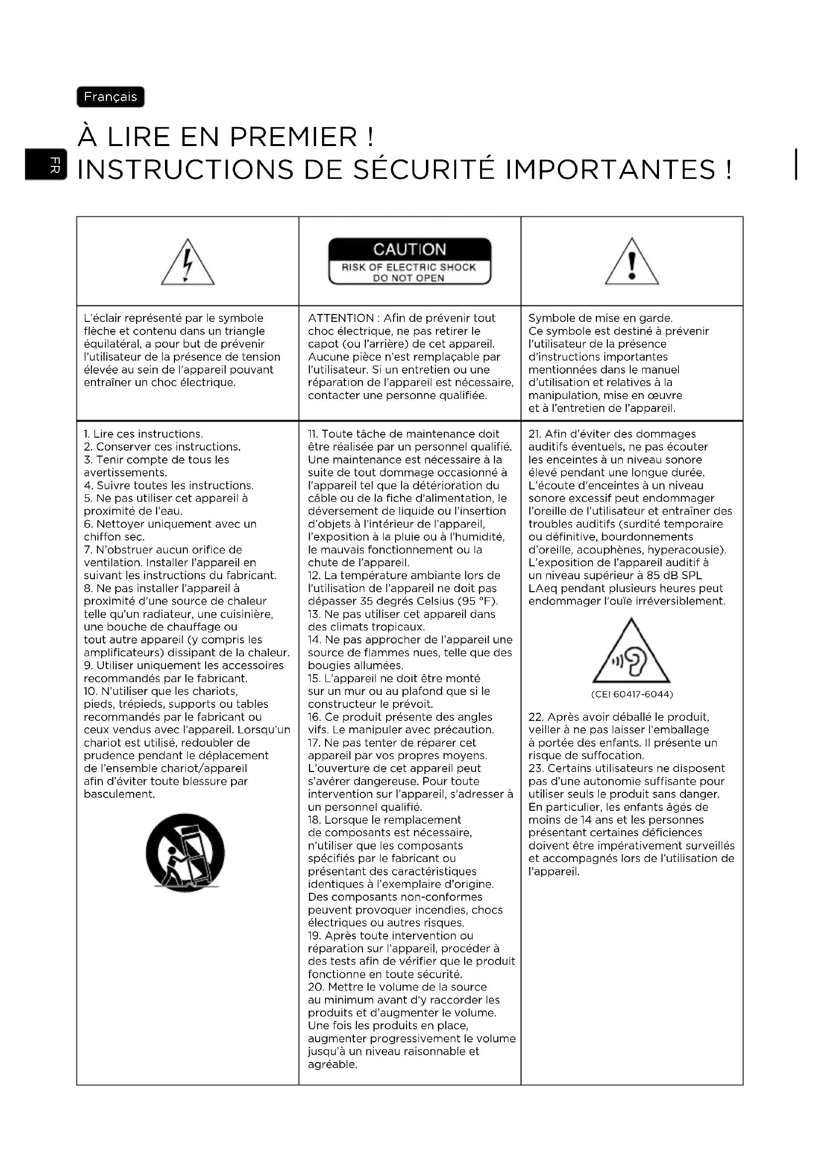 5/8 "x7 1/2 "x137/8" (93.1x19.1x35.2cm)39"x8 3/8 "x151/4" (98.9x21.2x38.8cm)Net weight (with grille)15.43lbs (7kg) 37.48lbs (17kg) 44.09lbs (20kg)Box dimensions(HxWxD) 3/4"x231/4"x15 3/8 " (50x59x39cm) 7/8 x41 3/8 "x12 5/8 "(48x105x32cm) 7/8"x43 1/4 x 13 3/8 " (48x110x34cm)Net weight (with packaging)17kg (37.5lbs, 2 pieces) 46.30lbs (21kg) 54.01lbs (24.5kg)FR À LIRE EN PREMIER ! INSTRUCTIONS DE SÉCURITÉ IMPORTANTES ! Français L’éclair représenté par le symbole flèche et contenu dans un triangle équilatéral, a pour but de prévenir l’utilisateur de la présence de tension élevée au sein de l’appareil pouvant entraîner un choc électrique. ATTENTION : Afin de prévenir tout choc électrique, ne pas retirer le capot (ou l’arrière) de cet appareil. Aucune pièce n’est remplaçable par l’utilisateur. Si un entretien ou une réparation de l’appareil est nécessaire, contacter une personne qualifiée. Symbole de mise en garde. Ce symbole est destiné à prévenir l’utilisateur de la présence d’instructions importantes mentionnées dans le manuel d’utilisation et relatives à la manipulation, mise en œuvre et à l’entretien de l’appareil.