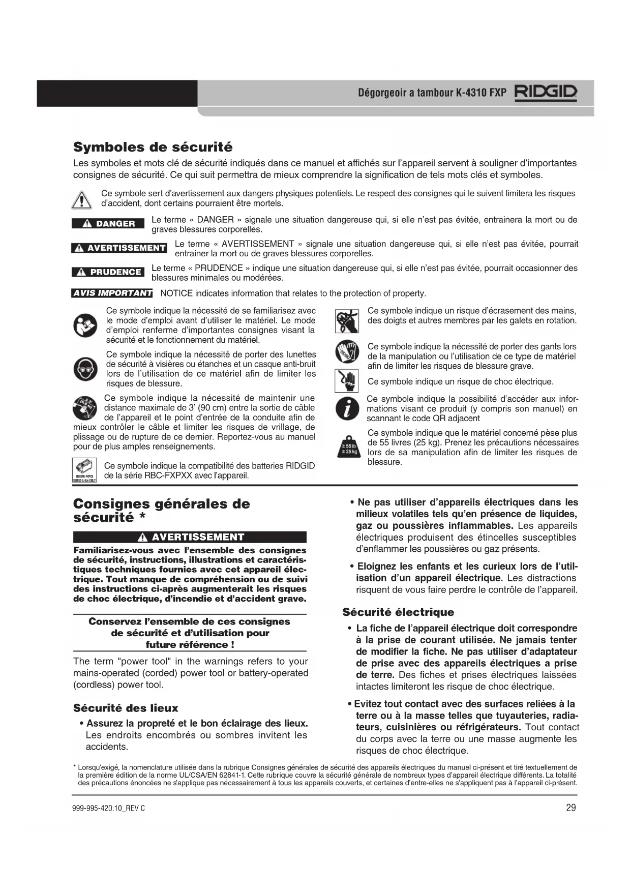 - Lorsqu’exigé, la nomenclature utilisée dans la rubrique Consignes générales de sécurité des appareils électriques du manuel ci-présent et tiré textuellement de la première édition de la norme UL/CSA/EN 62841-1. Cette rubrique couvre la sécurité générale de nombreux types d’appareil électrique différents. La totalité des précautions énoncées ne s’applique pas nécessairement à tous les appareils couverts, et certaines d’entre-elles ne s’appliquent pas à l’appareil ci-présent. Ce symbole indique la nécessité de maintenir une distance maximale de 3’ (90 cm) entre la sortie de câble de l’appareil et le point d’entrée de la conduite afin de mieux contrôler le câble et limiter les risques de vrillage, de plissage ou de rupture de ce dernier. Reportez-vous au manuel pour de plus amples renseignements. Ce symbole indique la compatibilité des batteries RIDGID de la série RBC-FXPXX avec l’appareil. USE RB-FXPXX SERIES Li-Ion ONLY Ce symbole indique que le matériel concerné pèse plus de 55 livres (25 kg). Prenez les précautions nécessaires lors de sa manipulation afin de limiter les risques de blessure. Ce symbole indique la possibilité d’accéder aux infor- mations visant ce produit (y compris son manuel) en scannant le code QR adjacentDégorgeoir a tambour K-4310 FXP