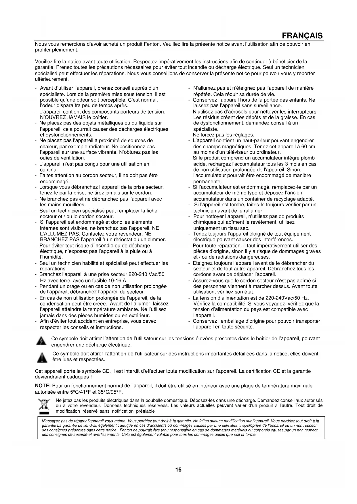 Botón de prioridad del micrófono: presión prolongada para activar o desactivar la prioridad del micrófono; la música se bajará automáticamente cuando hables por el micrófono.16 FRANÇAIS Nous vous remercions d’avoir acheté un produit Fenton. Veuillez lire la présente notice avant l’utilisation afin de pouvoir en profiter pleinement. Veuillez lire la notice avant toute utilisation. Respectez impérativement les instructions afin de continuer à bénéficier de la garantie. Prenez toutes les précautions nécessaires pour éviter tout incendie ou décharge électrique. Seul un technicien spécialisé peut effectuer les réparations. Nous vous conseillons de conserver la présente notice pour pouvoir vous y reporter ultérieurement. - Avant d’utiliser l’appareil, prenez conseil auprès d’un spécialiste. Lors de la première mise sous tension, il est possible qu’une odeur soit perceptible. C’est normal, l’odeur disparaîtra peu de temps après. - L’appareil contient des composants porteurs de tension. N’OUVREZ JAMAIS le boîtier. - Ne placez pas des objets métalliques ou du liquide sur l’appareil, cela pourrait causer des décharges électriques et dysfonctionnements.. - Ne placez pas l’appareil à proximité de sources de chaleur, par exemple radiateur. Ne positionnez pas l’appareil sur une surface vibrante. N’obturez pas les ouïes de ventilation. - L’appareil n’est pas conçu pour une utilisation en continu. - Faites attention au cordon secteur, il ne doit pas être endommagé. - Lorsque vous débranchez l’appareil de la prise secteur, tenez-le par la prise, ne tirez jamais sur le cordon. - Ne branchez pas et ne débranchez pas l’appareil avec les mains mouillées. - Seul un technicien spécialisé peut remplacer la fiche secteur et / ou le cordon secteur. - Si l’appareil est endommagé et donc les éléments internes sont visibles, ne branchez pas l’appareil, NE L’ALLUMEZ PAS. Contactez votre revendeur. NE BRANCHEZ PAS l’appareil à un rhéostat ou un dimmer. - Pour éviter tout risque d’incendie ou de décharge électrique, n’exposez pas l’appareil à la pluie ou à l’humidité. - Seul un technicien habilité et spécialisé peut effectuer les réparations - Branchez l’appareil à une prise secteur 220-240 Vac/50 Hz avec terre, avec un fusible 10-16 A. - Pendant un orage ou en cas de non utilisation prolongée de l’appareil, débranchez l’appareil du secteur. - En cas de non utilisation prolongée de l’appareil, de la condensation peut être créée. Avant de l’allumer, laissez l’appareil atteindre la température ambiante. Ne l’utilisez jamais dans des pièces humides ou en extérieur. - Afin d’éviter tout accident en entreprise, vous devez respecter les conseils et instructions. - N’allumez pas et n’éteignez pas l’appareil de manière répétée. Cela réduit sa durée de vie. - Conservez l’appareil hors de la portée des enfants. Ne laissez pas l’appareil sans surveillance. - N’utilisez pas d’aérosols pour nettoyer les interrupteurs. Les résidus créent des dépôts et de la graisse. En cas de dysfonctionnement, demandez conseil à un spécialiste. - Ne forcez pas les réglages. - L’appareil contient un haut-parleur pouvant engendrer des champs magnétiques. Tenez cet appareil à 60 cm au moins d’un téléviseur ou ordinateur. - Si le produit comprend un accumulateur intégré plomb- acide, rechargez l'accumulateur tous les 3 mois en cas de non utilisation prolongée de l'appareil. Sinon, l'accumulateur pourrait être endommagé de manière permanente. - Si l’accumulateur est endommagé, remplacez-le par un accumulateur de même type et déposez l’ancien accumulateur dans un container de recyclage adapté. - Si l’appareil est tombé, faites-le toujours vérifier par un technicien avant de le rallumer. - Pour nettoyer l’appareil, n’utilisez pas de produits chimiques qui abîment le revêtement, utilisez uniquement un tissu sec. - Tenez toujours l’appareil éloigné de tout équipement électrique pouvant causer des interférences. - Pour toute réparation, il faut impérativement utiliser des pièces d’origine, sinon il y a risque de dommages graves et / ou de radiations dangereuses. - Eteignez toujours l’appareil avant de le débrancher du secteur et de tout autre appareil. Débranchez tous les cordons avant de déplacer l’appareil. - Assurez-vous que le cordon secteur n’est pas abîmé si des personnes viennent à marcher dessus. Avant toute utilisation, vérifiez son état. - La tension d’alimentation est de 220-240Vac/50 Hz. Vérifiez la compatibilité. Si vous voyagez, vérifiez que la tension d’alimentation du pays est compatible avec l’appareil. - Conservez l’emballage d’origine pour pouvoir transporter l’appareil en toute sécurité. Ce symbole doit attirer l’attention de l’utilisateur sur les tensions élevées présentes dans le boîtier de l’appareil, pouvant engendrer une décharge électrique. Ce symbole doit attirer l’attention de l’utilisateur sur des instructions importantes détaillées dans la notice, elles doivent être lues et respectées. Cet appareil porte le symbole CE. Il est interdit d’effectuer toute modification sur l’appareil. La certification CE et la garantie deviendraient caduques ! NOTE: Pour un fonctionnement normal de l’appareil, il doit être utilisé en intérieur avec une plage de température maximale autorisée entre 5°C/41°F et 35°C/95°F. Ne jetez pas les produits électriques dans la poubelle domestique. Déposez-les dans une décharge. Demandez conseil aux autorisés ou à votre revendeur. Données techniques réservées. Les valeurs actuelles peuvent varier d’un produit à l’autre. Tout droit de modification réservé sans notification préalable N’essayez pas de réparer l’appareil vous-même. Vous perdriez tout droit à la garantie. Ne faites aucune modification sur l’appareil. V