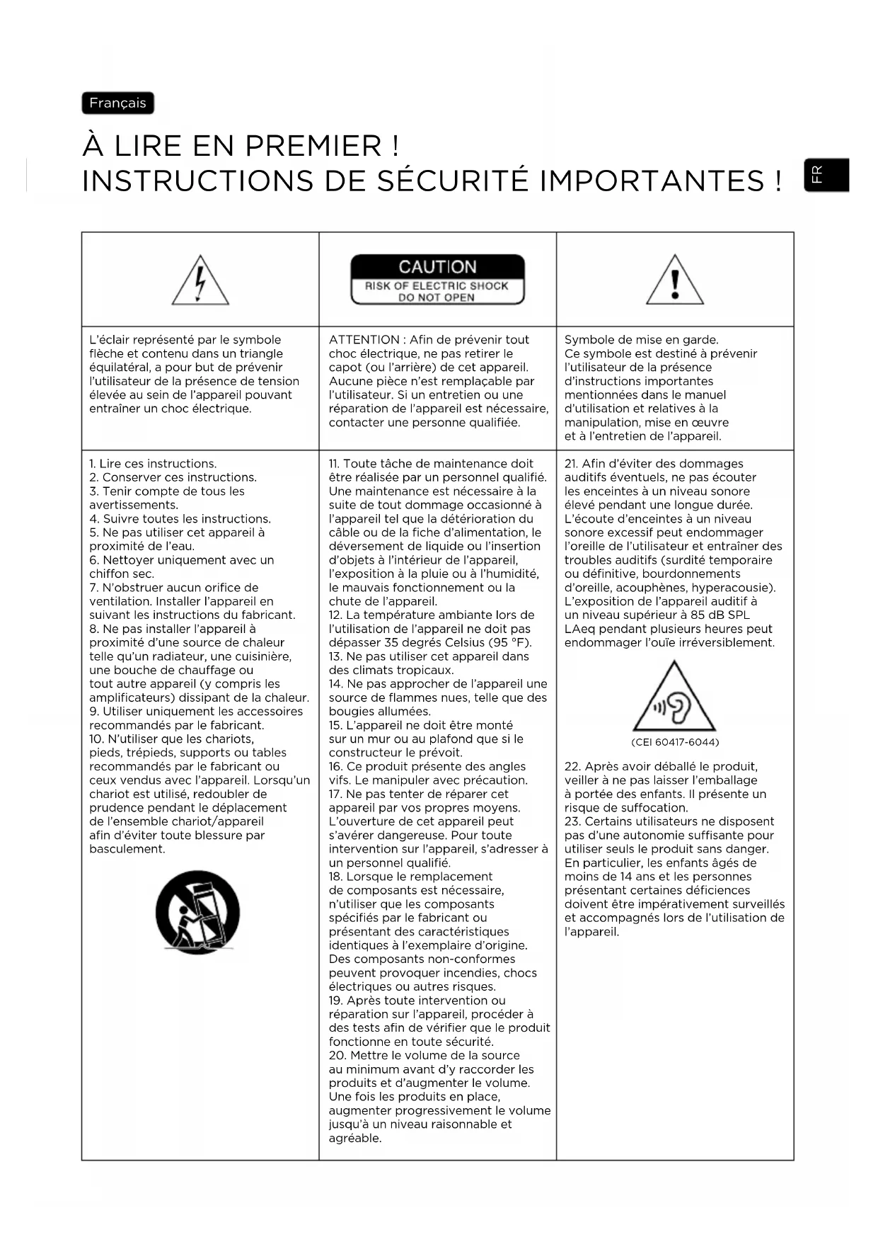 Conditions de garantie En cas de problème, s’adresser à votre revendeur Focal. La garantie légale pour la France sur tout matériel Focal est de 2 ans à partir de la date d’achat. En cas de non- conformité du matériel, celui-ci doit être expédié, dans son emballage d’origine auprès du revendeur, lequel analysera le matériel et déterminera la nature de la panne. Si celui-ci est sous garantie et que les conditions de déclenchement de la garantie sont réunies, le matériel vous sera réparé ou remplacé selon les conditions applicables en matière de garantie légale à la date d’achat de l’appareil. Dans le cas contraire, un devis de réparation vous sera proposé. La garantie ne couvre pas les dommages résultant d’une mauvaise utilisation ou d’un branchement incorrect (bobines mobiles brûlées par exemple...). En dehors de la France, le matériel Focal est couvert par une garantie dont les conditions sont fixées ou mises en œuvre localement par le distributeur officiel Focal de chaque pays, conformément aux lois en vigueur sur le territoire concerné. Fabriqué sous licence de Dolby Laboratories. Dolby, Dolby Atmos et le symbole double D sont des marques déposées de Dolby Laboratories. Manuel d’utilisationEN READ FIRST! IMPORTANT SAFETY INSTRUCTIONS! English The bolt of lightning in an equilateral triangle warns the user that the device has high voltage that could result in a risk of electric shock.
