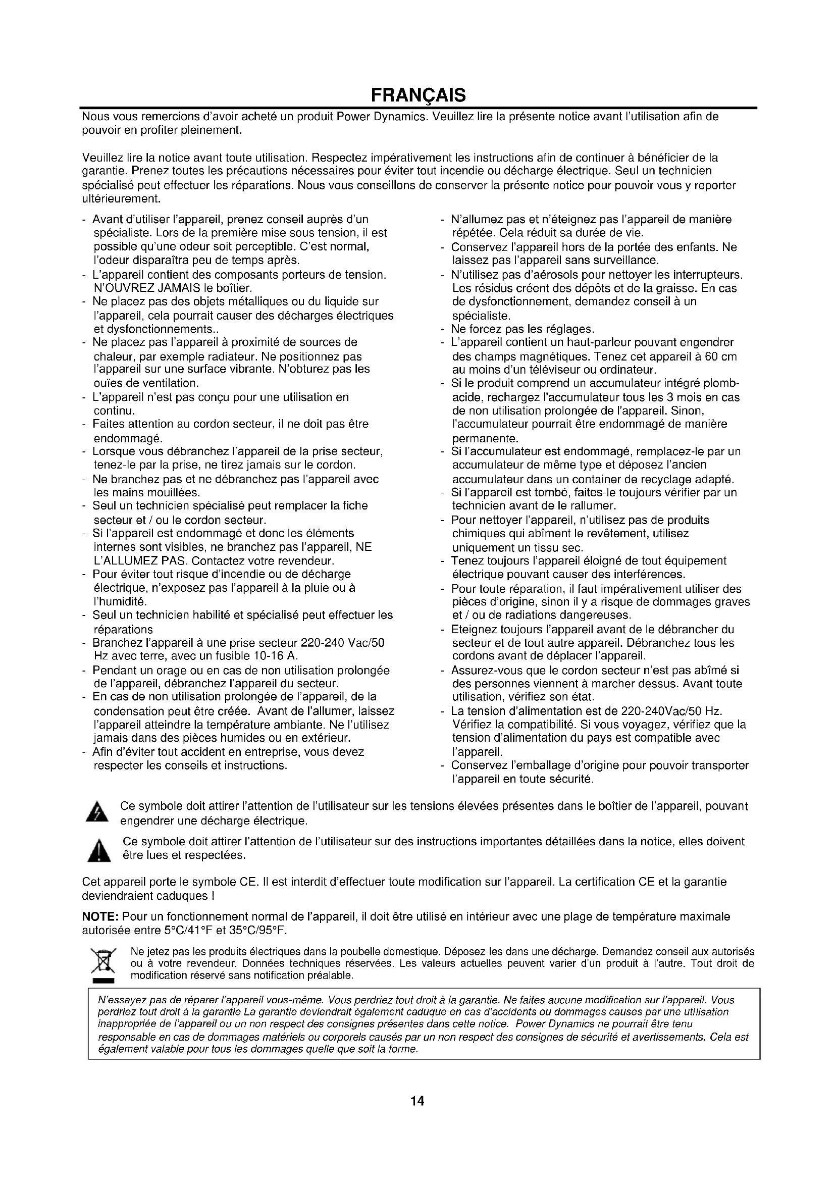 Si se requiere contraseña, puede ingresar "0000". Atención: La distancia BT es de aprox. 10 metros sin barrera.14 FRANÇAIS Nous vous remercions d’avoir acheté un produit Power Dynamics. Veuillez lire la présente notice avant l’utilisation afin de pouvoir en profiter pleinement. Veuillez lire la notice avant toute utilisation. Respectez impérativement les instructions afin de continuer à bénéficier de la garantie. Prenez toutes les précautions nécessaires pour éviter tout incendie ou décharge électrique. Seul un technicien spécialisé peut effectuer les réparations. Nous vous conseillons de conserver la présente notice pour pouvoir vous y reporter ultérieurement. - Avant d’utiliser l’appareil, prenez conseil auprès d’un spécialiste. Lors de la première mise sous tension, il est possible qu’une odeur soit perceptible. C’est normal, l’odeur disparaîtra peu de temps après. - L’appareil contient des composants porteurs de tension. N’OUVREZ JAMAIS le boîtier. - Ne placez pas des objets métalliques ou du liquide sur l’appareil, cela pourrait causer des décharges électriques et dysfonctionnements.. - Ne placez pas l’appareil à proximité de sources de chaleur, par exemple radiateur. Ne positionnez pas l’appareil sur une surface vibrante. N’obturez pas les ouïes de ventilation. - L’appareil n’est pas conçu pour une utilisation en continu. - Faites attention au cordon secteur, il ne doit pas être endommagé. - Lorsque vous débranchez l’appareil de la prise secteur, tenez-le par la prise, ne tirez jamais sur le cordon. - Ne branchez pas et ne débranchez pas l’appareil avec les mains mouillées. - Seul un technicien spécialisé peut remplacer la fiche secteur et / ou le cordon secteur. - Si l’appareil est endommagé et donc les éléments internes sont visibles, ne branchez pas l’appareil, NE L’ALLUMEZ PAS. Contactez votre revendeur. - Pour éviter tout risque d’incendie ou de décharge électrique, n’exposez pas l’appareil à la pluie ou à l’humidité. - Seul un technicien habilité et spécialisé peut effectuer les réparations - Branchez l’appareil à une prise secteur 220-240 Vac/50 Hz avec terre, avec un fusible 10-16 A. - Pendant un orage ou en cas de non utilisation prolongée de l’appareil, débranchez l’appareil du secteur. - En cas de non utilisation prolongée de l’appareil, de la condensation peut être créée. Avant de l’allumer, laissez l’appareil atteindre la température ambiante. Ne l’utilisez jamais dans des pièces humides ou en extérieur. - Afin d’éviter tout accident en entreprise, vous devez respecter les conseils et instructions. - N’allumez pas et n’éteignez pas l’appareil de manière répétée. Cela réduit sa durée de vie. - Conservez l’appareil hors de la portée des enfants. Ne laissez pas l’appareil sans surveillance. - N’utilisez pas d’aérosols pour nettoyer les interrupteurs. Les résidus créent des dépôts et de la graisse. En cas de dysfonctionnement, demandez conseil à un spécialiste. - Ne forcez pas les réglages. - L’appareil contient un haut-parleur pouvant engendrer des champs magnétiques. Tenez cet appareil à 60 cm au moins d’un téléviseur ou ordinateur. - Si le produit comprend un accumulateur intégré plomb- acide, rechargez l'accumulateur tous les 3 mois en cas de non utilisation prolongée de l'appareil. Sinon, l'accumulateur pourrait être endommagé de manière permanente. - Si l’accumulateur est endommagé, remplacez-le par un accumulateur de même type et déposez l’ancien accumulateur dans un container de recyclage adapté. - Si l’appareil est tombé, faites-le toujours vérifier par un technicien avant de le rallumer. - Pour nettoyer l’appareil, n’utilisez pas de produits chimiques qui abîment le revêtement, utilisez uniquement un tissu sec. - Tenez toujours l’appareil éloigné de tout équipement électrique pouvant causer des interférences. - Pour toute réparation, il faut impérativement utiliser des pièces d’origine, sinon il y a risque de dommages graves et / ou de radiations dangereuses. - Eteignez toujours l’appareil avant de le débrancher du secteur et de tout autre appareil. Débranchez tous les cordons avant de déplacer l’appareil. - Assurez-vous que le cordon secteur n’est pas abîmé si des personnes viennent à marcher dessus. Avant toute utilisation, vérifiez son état. - La tension d’alimentation est de 220-240Vac/50 Hz. Vérifiez la compatibilité. Si vous voyagez, vérifiez que la tension d’alimentation du pays est compatible avec l’appareil. - Conservez l’emballage d’origine pour pouvoir transporter l’appareil en toute sécurité. Ce symbole doit attirer l’attention de l’utilisateur sur les tensions élevées présentes dans le boîtier de l’appareil, pouvant engendrer une décharge électrique. Ce symbole doit attirer l’attention de l’utilisateur sur des instructions importantes détaillées dans la notice, elles doivent être lues et respectées. Cet appareil porte le symbole CE. Il est interdit d’effectuer toute modification sur l’appareil. La certification CE et la garantie deviendraient caduques ! NOTE: Pour un fonctionnement normal de l’appareil, il doit être utilisé en intérieur avec une plage de température maximale autorisée entre 5°C/41°F et 35°C/95°F. Ne jetez pas les produits électriques dans la poubelle domestique. Déposez-les dans une décharge. Demandez conseil aux autorisés ou à votre revendeur. Données techniques réservées. Les valeurs actuelles peuvent varier d’un produit à l’autre. Tout droit de modification réservé sans notification préalable. N’essayez pas de réparer l’appareil vous-même. Vous perdriez tout droit à la garantie. Ne faites aucune modification sur l’appareil. Vous perdriez tout droit à la garantie La garantie deviendrait également caduque en cas d’accidents ou dommages caus