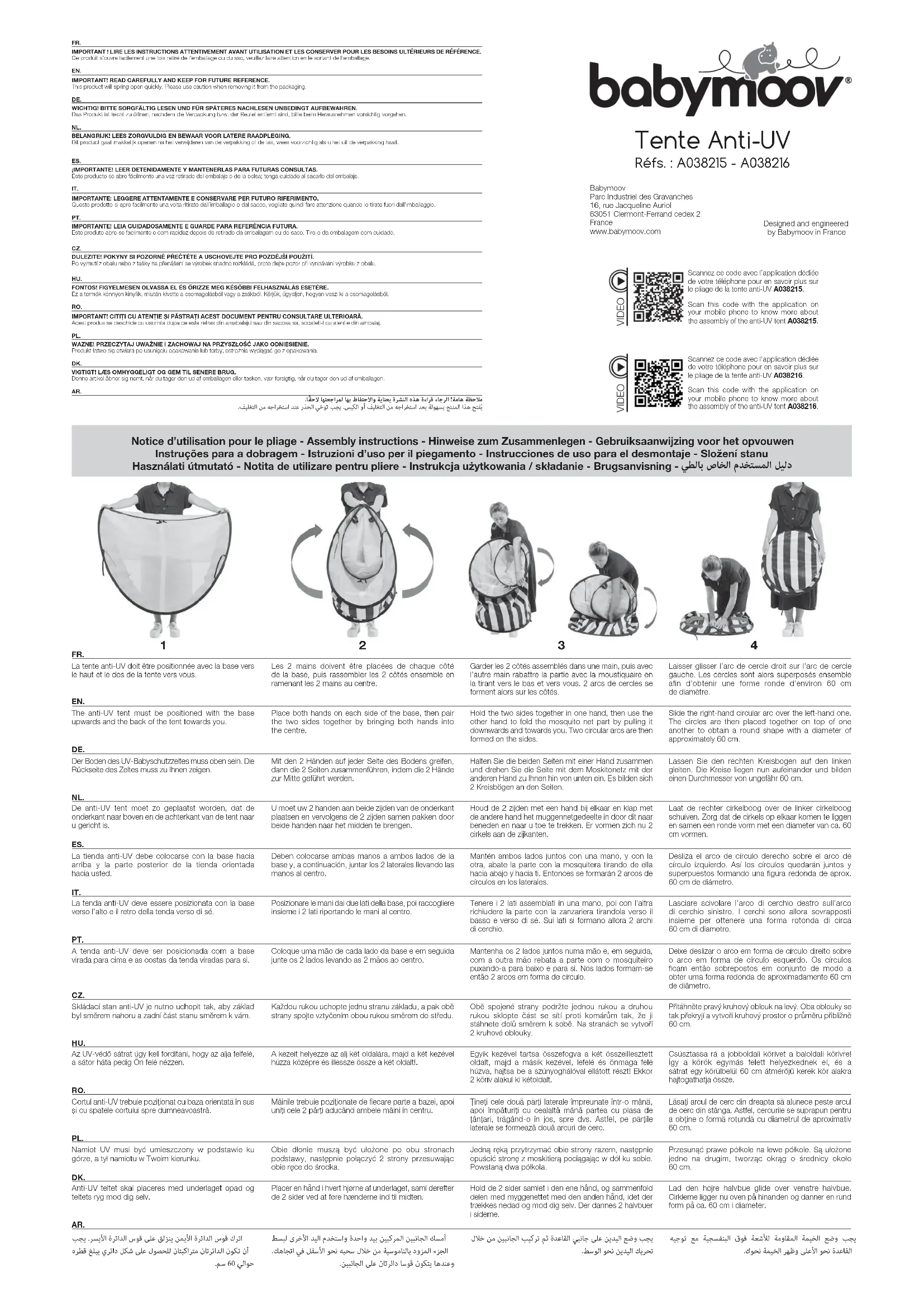 Tente Anti-UV Réfs. : A038215 - A038216 FR. IMPORTANT ! LIRE LES INSTRUCTIONS ATTENTIVEMENT AVANT UTILISATION ET LES CONSERVER POUR LES BESOINS ULTÉRIEURS DE RÉFÉRENCE. Ce produit s’ouvre facilement une fois retiré de l’emballage ou du sac, veuillez faire attention en le sortant de l’emballage. AR.