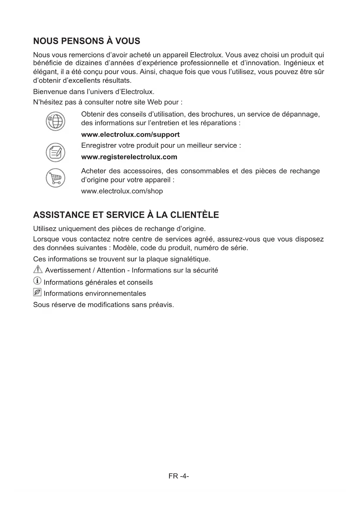 Nous vous remercions d’avoir acheté un appareil Electrolux. Vous avez choisi un produit qui bénéficie de dizaines d’années d’expérience professionnelle et d’innovation. Ingénieux et élégant, il a été conçu pour vous. Ainsi, chaque fois que vous l’utilisez, vous pouvez être sûr d’obtenir d’excellents résultats. Bienvenue dans l’univers d’Electrolux. N’hésitez pas à consulter notre site Web pour : Obtenir des conseils d’utilisation, des brochures, un service de dépannage, des informations sur l’entretien et les réparations : www.electrolux.com/support Enregistrer votre produit pour un meilleur service : www.registerelectrolux.com Acheter des accessoires, des consommables et des pièces de rechange d’origine pour votre appareil : www.electrolux.com/shop