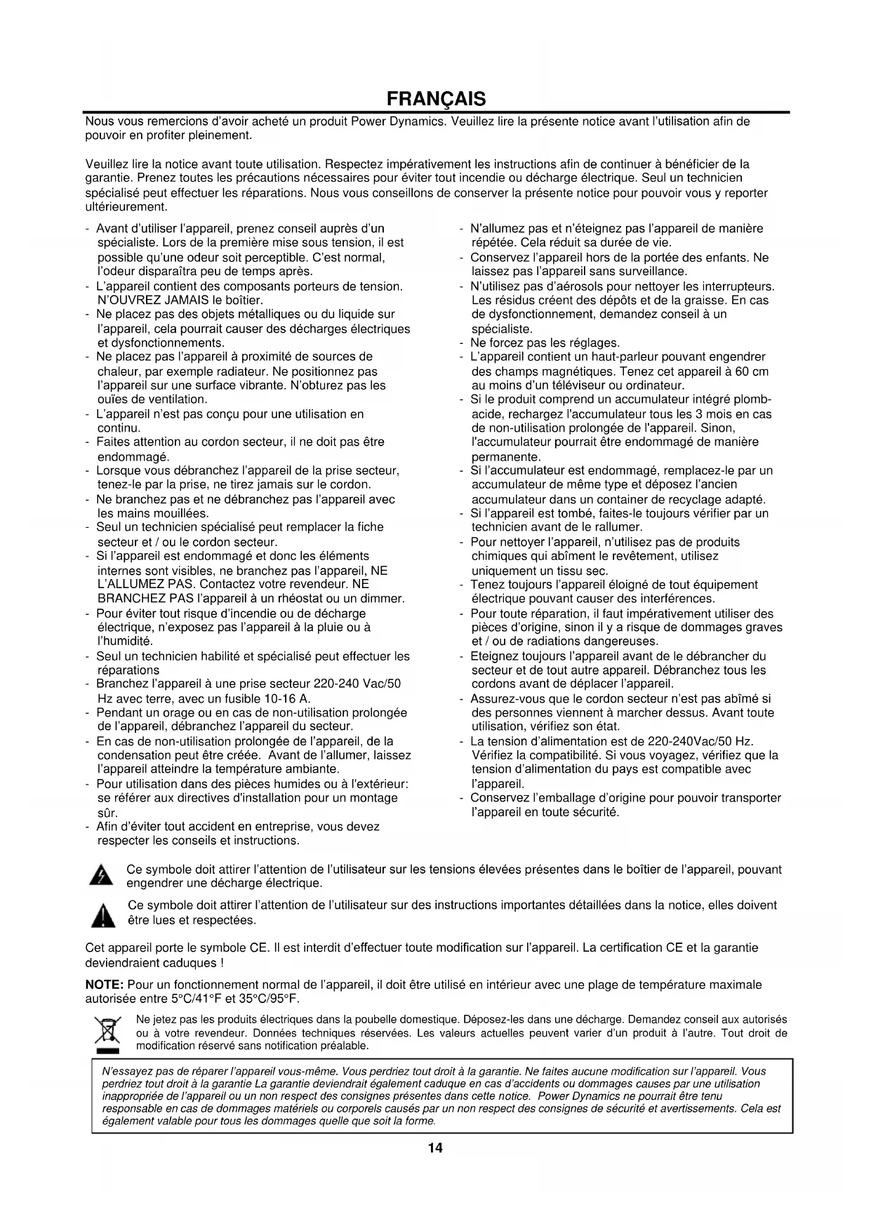 Elección entre BT y WIFI14 FRANÇAIS Nous vous remercions d’avoir acheté un produit Power Dynamics. Veuillez lire la présente notice avant l’utilisation afin de pouvoir en profiter pleinement. Veuillez lire la notice avant toute utilisation. Respectez impérativement les instructions afin de continuer à bénéficier de la garantie. Prenez toutes les précautions nécessaires pour éviter tout incendie ou décharge électrique. Seul un technicien spécialisé peut effectuer les réparations. Nous vous conseillons de conserver la présente notice pour pouvoir vous y reporter ultérieurement. - Avant d’utiliser l’appareil, prenez conseil auprès d’un spécialiste. Lors de la première mise sous tension, il est possible qu’une odeur soit perceptible. C’est normal, l’odeur disparaîtra peu de temps après. - L’appareil contient des composants porteurs de tension. N’OUVREZ JAMAIS le boîtier. - Ne placez pas des objets métalliques ou du liquide sur l’appareil, cela pourrait causer des décharges électriques et dysfonctionnements. - Ne placez pas l’appareil à proximité de sources de chaleur, par exemple radiateur. Ne positionnez pas l’appareil sur une surface vibrante. N’obturez pas les ouïes de ventilation. - L’appareil n’est pas conçu pour une utilisation en continu. - Faites attention au cordon secteur, il ne doit pas être endommagé. - Lorsque vous débranchez l’appareil de la prise secteur, tenez-le par la prise, ne tirez jamais sur le cordon. - Ne branchez pas et ne débranchez pas l’appareil avec les mains mouillées. - Seul un technicien spécialisé peut remplacer la fiche secteur et / ou le cordon secteur. - Si l’appareil est endommagé et donc les éléments internes sont visibles, ne branchez pas l’appareil, NE L’ALLUMEZ PAS. Contactez votre revendeur. NE BRANCHEZ PAS l’appareil à un rhéostat ou un dimmer. - Pour éviter tout risque d’incendie ou de décharge électrique, n’exposez pas l’appareil à la pluie ou à l’humidité. - Seul un technicien habilité et spécialisé peut effectuer les réparations - Branchez l’appareil à une prise secteur 220-240 Vac/50 Hz avec terre, avec un fusible 10-16 A. - Pendant un orage ou en cas de non-utilisation prolongée de l’appareil, débranchez l’appareil du secteur. - En cas de non-utilisation prolongée de l’appareil, de la condensation peut être créée. Avant de l’allumer, laissez l’appareil atteindre la température ambiante. - Pour utilisation dans des pièces humides ou à l'extérieur: se référer aux directives d'installation pour un montage sûr. - Afin d’éviter tout accident en entreprise, vous devez respecter les conseils et instructions. - N’allumez pas et n’éteignez pas l’appareil de manière répétée. Cela réduit sa durée de vie. - Conservez l’appareil hors de la portée des enfants. Ne laissez pas l’appareil sans surveillance. - N’utilisez pas d’aérosols pour nettoyer les interrupteurs. Les résidus créent des dépôts et de la graisse. En cas de dysfonctionnement, demandez conseil à un spécialiste. - Ne forcez pas les réglages. - L’appareil contient un haut-parleur pouvant engendrer des champs magnétiques. Tenez cet appareil à 60 cm au moins d’un téléviseur ou ordinateur. - Si le produit comprend un accumulateur intégré plomb- acide, rechargez l'accumulateur tous les 3 mois en cas de non-utilisation prolongée de l'appareil. Sinon, l'accumulateur pourrait être endommagé de manière permanente. - Si l’accumulateur est endommagé, remplacez-le par un accumulateur de même type et déposez l’ancien accumulateur dans un container de recyclage adapté. - Si l’appareil est tombé, faites-le toujours vérifier par un technicien avant de le rallumer. - Pour nettoyer l’appareil, n’utilisez pas de produits chimiques qui abîment le revêtement, utilisez uniquement un tissu sec. - Tenez toujours l’appareil éloigné de tout équipement électrique pouvant causer des interférences. - Pour toute réparation, il faut impérativement utiliser des pièces d’origine, sinon il y a risque de dommages graves et / ou de radiations dangereuses. - Eteignez toujours l’appareil avant de le débrancher du secteur et de tout autre appareil. Débranchez tous les cordons avant de déplacer l’appareil. - Assurez-vous que le cordon secteur n’est pas abîmé si des personnes viennent à marcher dessus. Avant toute utilisation, vérifiez son état. - La tension d’alimentation est de 220-240Vac/50 Hz. Vérifiez la compatibilité. Si vous voyagez, vérifiez que la tension d’alimentation du pays est compatible avec l’appareil. - Conservez l’emballage d’origine pour pouvoir transporter l’appareil en toute sécurité. Ce symbole doit attirer l’attention de l’utilisateur sur les tensions élevées présentes dans le boîtier de l’appareil, pouvant engendrer une décharge électrique. Ce symbole doit attirer l’attention de l’utilisateur sur des instructions importantes détaillées dans la notice, elles doivent être lues et respectées. Cet appareil porte le symbole CE. Il est interdit d’effectuer toute modification sur l’appareil. La certification CE et la garantie deviendraient caduques ! NOTE: Pour un fonctionnement normal de l’appareil, il doit être utilisé en intérieur avec une plage de température maximale autorisée entre 5°C/41°F et 35°C/95°F. Ne jetez pas les produits électriques dans la poubelle domestique. Déposez-les dans une décharge. Demandez conseil aux autorisés ou à votre revendeur. Données techniques réservées. Les valeurs actuelles peuvent varier d’un produit à l’autre. Tout droit de modification réservé sans notification préalable. N’essayez pas de réparer l’appareil vous-même. Vous perdriez tout droit à la garantie. Ne faites aucune modification sur l’appareil. Vous perdriez tout droit à la garantie La garantie deviendrait également caduque en c