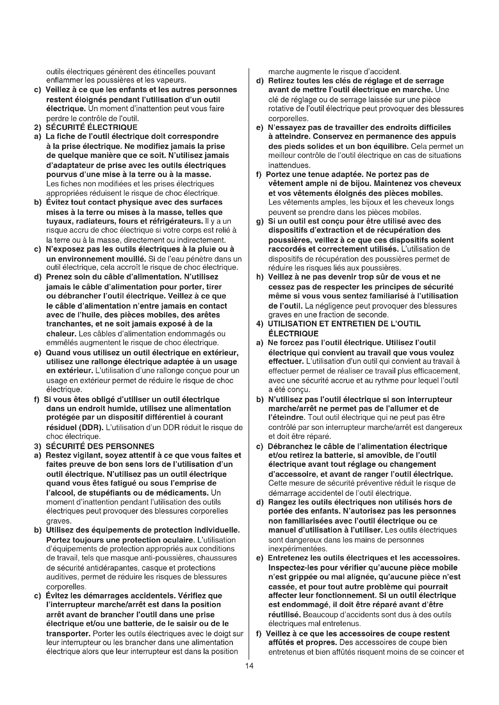 a) Restez vigilant, soyez attentif à ce que vous faites et faites preuve de bon sens lors de l’utilisation d’un outil électrique. N’utilisez pas un outil électrique quand vous êtes fatigué ou sous l’emprise de l’alcool,destupéantsoudemédicaments.Un moment d’inattention pendant l’utilisation des outils électriques peut provoquer des blessures corporelles graves. b) Utilisez des équipements de protection individuelle. Portez toujours une protection oculaire. L’utilisation d’équipements de protection appropriés aux conditions de travail, tels que masque anti-poussières, chaussures de sécurité antidérapantes, casque et protections auditives, permet de réduire les risques de blessures corporelles. c) Évitezlesdémarragesaccidentels.Vériezque l’interrupteur marche/arrêt est dans la position arrêt avant de brancher l’outil dans une prise électrique et/ou une batterie, de le saisir ou de le transporter. Porter les outils électriques avec le doigt sur leur interrupteur ou les brancher dans une alimentation électrique alors que leur interrupteur est dans la position15