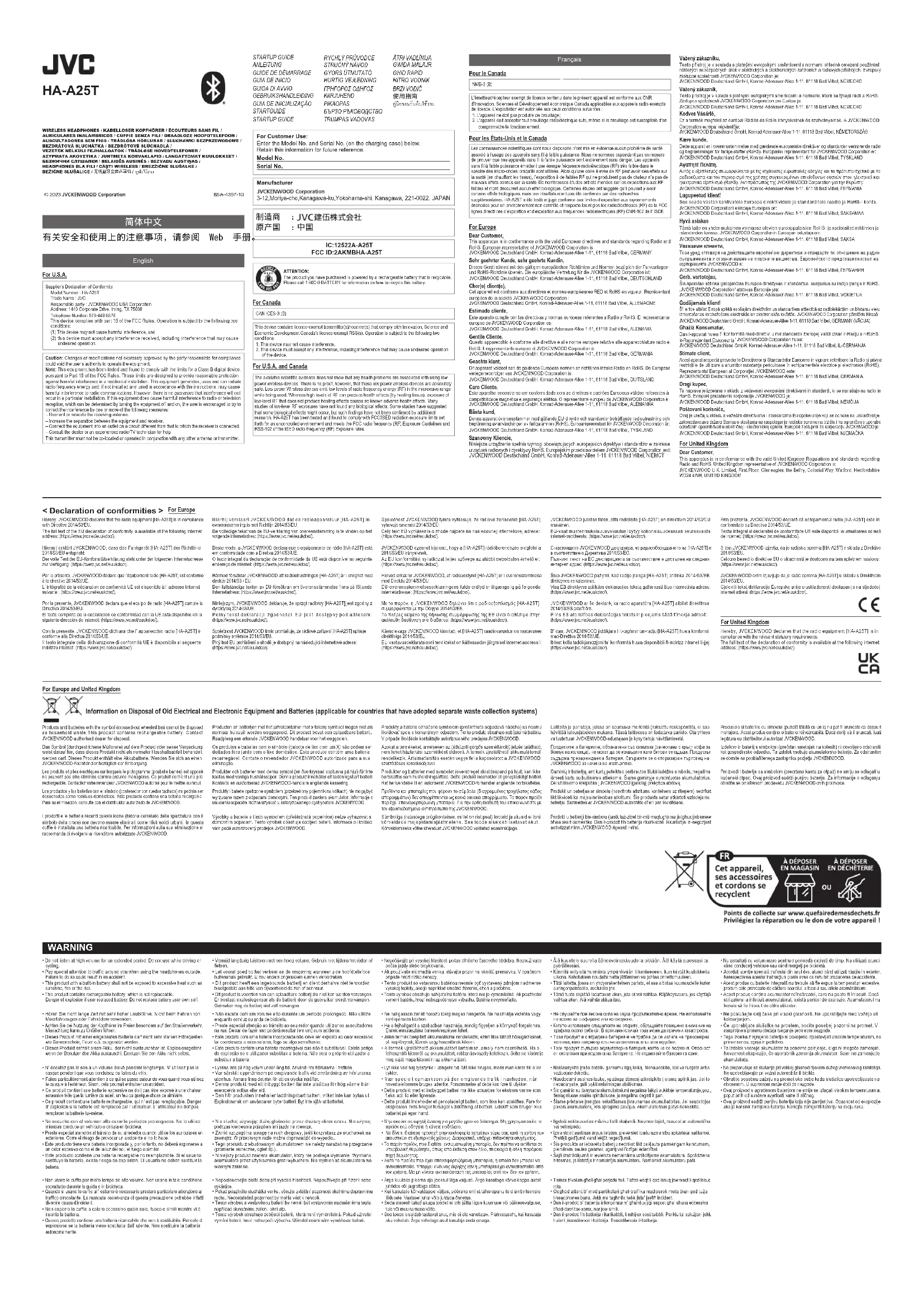 volum għoli għal ħinijiet twal.Pentru a preveni posibila deteriorare a auzului, nu ascultați la volum mare pentru perioade lungi de timp.Da se izognete poškodbam sluha, ne poslušajte dalj časa pri visoki glasnosti.Kako biste spriječili moguće oštećenje sluha, izbjegavajte dugotrajno slušanje pri visokoj glasnoći.WARNINGWarnings for batteryPlease do not handle the battery in the following manners.It can lead to an explosion or leakage of flammable liquids and gases.• Dispose in fire, discard, crush or cut• Leave in extremely high temperature environment• Leave in extremely low pressure environmentWarnhinweise zur BatterieBitte behandeln Sie die Batterie nicht wie folgt.Das kann zu einer Explosion oder zum Austritt entflammbarer Flüssigkeiten und Gase führen.• Ins Feuer werfen, wegwerfen, zerbrechen oder aufschneiden• Bei extrem hohen Temperaturen liegen lassen• Bei extrem niedrigem Luftdruck liegen lassenOstrzeżenia dotyczące akumulatoraZ akumulatorem nie wolno obchodzić się w poniższy sposób.Może to doprowadzić do wybuchu lub wycieku łatwopalnych cieczy i gazów.• Spalać, wyrzucać, zgniatać lub ciąć Pozostawiać w środowisku o bardzo wysokiej temperaturze• Pozostawiać w środowisku o bardzo niskim ciśnieniuПредупреждения за батериятаМоля, не работете с батерията по следните начини.Може да доведе до експлозия или изтичане на запалими течности и газове. Не изхвърляйте в огън, не трошете или не нарязвайте• Не дръжте при изключително висока температура на околната среда• Не оставяйте в среда с изключително ниско наляганеPerspėjimai dėl akumuliatoriausNesielkite su akumuliatoriumi taip, kaip aprašyta toliau.Tai gali sukelti degių skysčių ir dujų sprogimą ar nutekėjimą.• Mesti į ugnį, naikinti, traiškyti arba pjaustyti• Palikti itin aukštos temperatūros aplinkoje• Palikti itin žemo slėgio aplinkojeBrīdinājumi par akumulatoruLūdzam neapieties ar akumulatoru tālāk norādītajos veidos.Tas var izraisīt viegli uzliesmojošu šķidrumu un gāzu eksploziju vai noplūdi. Iznīcināt, iemetot ugunī, izmetot, sasmalcinot vai sagriežot;• Atstāt ļoti vidē ar augstu temperatūru• Atstāt vidē ar ļoti zemu spiedienuTwissijiet rigward il-batterijaJekk jogħġbok tiħħendiljax il-batterija bil-modi li ġejjin.Tista twassal għal splużjoni jew tnixxija ta likwidi u gassijiet li jaqbdu.• Tarmiha fin-nar, twarrabha, tfarrakha jew tqattagħha• Tħalliha f ambjent b temperatura estremament għolja• Tħalliha f ambjent bi pressjoni estremament baxxaAvertismente privind bateriaNu manevrați bateria în următoarele moduri.Poate duce la explozia sau scurgerea lichidelor și a gazelor inflamabile.• Aruncați în foc, aruncați, zdrobiți sau tăiați• Lăsați în mediul de temperatură extrem de ridicată• Lăsați într-un mediu de presiune extrem de scăzutăOpozorila za baterijoProsimo, da z baterijo ne ravnate na naslednje načine.Lahko povzroči eksplozijo ali puščanje vnetljivih tekočin in plinov.• Ne odlagajte v ogenj, zavrzite, zdrobite ali režite• Ne pustite v okolju z zelo visokimi temperaturami• Ne pustite v okolju z zelo nizkim tlakomUpozorenja za baterijuMolimo, nemojte rukovati baterijom na sljedeće načine.To može dovesti do eksplozije ili istjecanja zapaljivih tekućina i plinova.• Bacati u vatru, odbacivati, razbijati ili rezati• Ostaviti u okruženju ekstremno visoke temperature• Ostaviti u okruženju ekstremno niskog tlakaVarování týkající se baterieS baterií nenakládejte následujícími způsoby.Mohlo by dojít k výbuchu nebo úniku hořlavých kapalin a plynů.• Vhození baterie do ohně, odhození, rozdrcení nebo rozříznutí baterie Ponechání baterie v prostředí s extrémně vysokou teplotou Ponechání baterie v prostředí s extrémně nízkým tlakemVarovania týkajúce sa batérieS batériou nemanipulujte nasledujúcimi spôsobmi.Mohlo by to viesť k výbuchu alebo úniku horľavých kvapalín a plynov.• Nezahadzujte do ohňa, nelikvidujte, nedrvte alebo nerežte• Nenechávajte v prostredí s extrémne vysokou teplotou• Nechávajte v prostredí s extrémne nízkym tlakomFigyelmeztetések az akkumulátorraKérjük, ne kezelje az akkumulátort az alábbi módon.Ez gyúlékony folyadékok és gázok robbanásához vagy szivárgásához vezethet.• Dobja tűzbe, dobja ki, törje össze vagy vágja szét• Hagyja extrém magas hőmérsékletű környezetben• Hagyja rendkívül alacsony nyomású környezetbenAdvarsler for batteriHåndtér ikke batteriet på følgende måder.Det kan føre til eksplosion i eller lækage af brændbare væsker og gasser.• Må ikke kasseres i åben ild, bortskaffes, knuses eller skæres i Må ikke efterlades på steder med meget høje temperaturer Må ikke efterlades på steder, der er under meget lavt trykΠροειδοποιήσεις για την μπαταρίαΜη χειρίζεστε την μπαταρία με τους παρακάτω τρόπους.Μπορεί να προκληθεί έκρηξη ή διαρροή εύφλεκτων υγρών και αερίων. Την αφήσετε στη φωτιά, την πετάξετε, τη σπάσετε ή κάψετε• Την αφήσετε σε εξαιρετικά υψηλή θερμοκρασία περιβάλλοντος• Την αφήσετε σε περιβάλλον με εξαιρετικά χαμηλή πίεσηAku hoiatusedPalun ärge käidelge akut järgmistel viisidel.See võib põhjustada tuleohtlike vedelike ja gaaside plahvatuse või lekke.• Põletades, visates ära, purustades või lõigates• Jättes väga kõrge temperatuuriga keskkonda• Jättes väga madala rõhuga kes