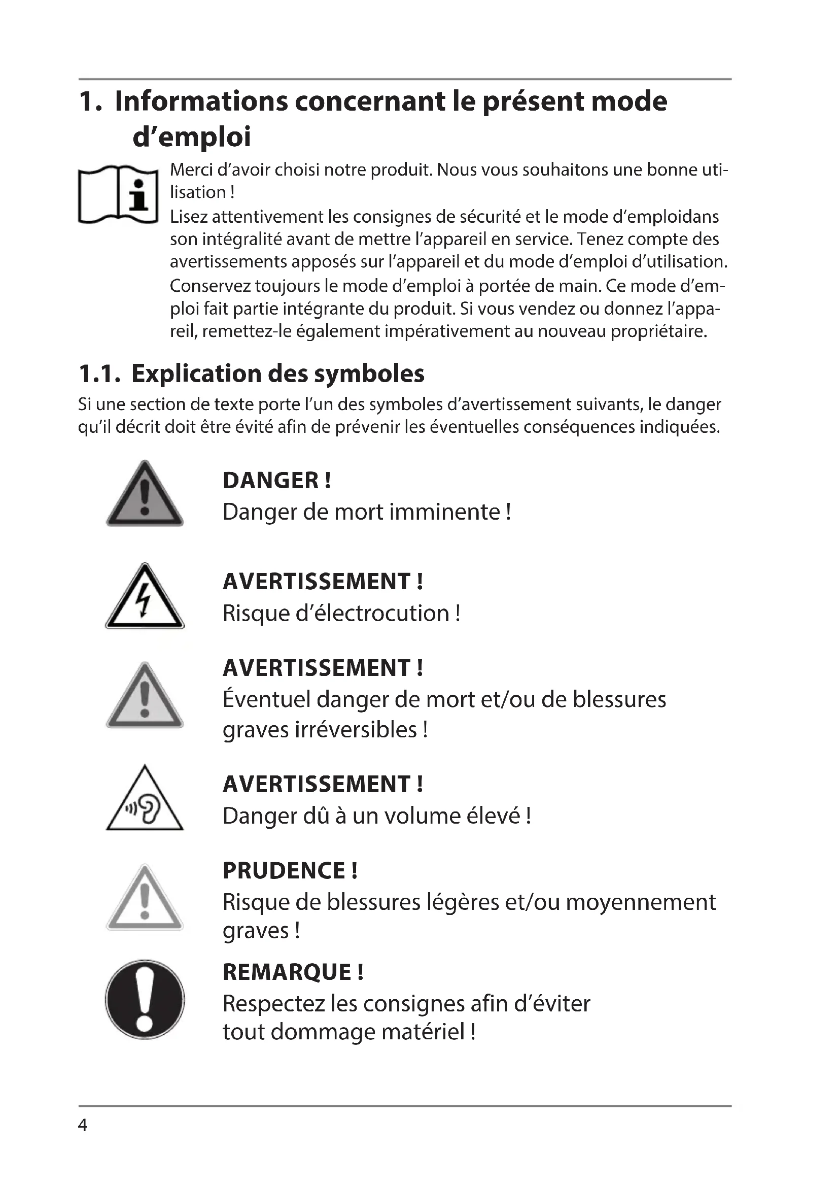 d’emploi Merci d’avoir choisi notre produit. Nous vous souhaitons une bonne uti- lisation! Lisez attentivement les consignes de sécurité et le mode d’emploidans son intégralité avant de mettre l’appareil en service. Tenez compte des avertissements apposés sur l’appareil et du mode d’emploi d’utilisation. Conservez toujours le mode d’emploi à portée de main. Ce mode d’em- ploi fait partie intégrante du produit. Si vous vendez ou donnez l’appa- reil, remettez-le également impérativement au nouveau propriétaire. 1.1. Explication des symboles Si une section de texte porte l’un des symboles d’avertissement suivants, le danger qu’il décrit doit être évité afin de prévenir les éventuelles conséquences indiquées. DANGER! Danger de mort imminente! AVERTISSEMENT! Risque d’électrocution! AVERTISSEMENT! Éventuel danger de mort et/ou de blessures graves irréversibles! AVERTISSEMENT! Danger dû à un volume élevé! PRUDENCE! Risque de blessures légères et/ou moyennement graves! REMARQUE! Respectez les consignes afin d’éviter tout dommage matériel!5 Informations complémentaires concernant l’utilisation de l’ap- pareil! Tenez compte des remarques contenues dans le mode d’em- ploi !