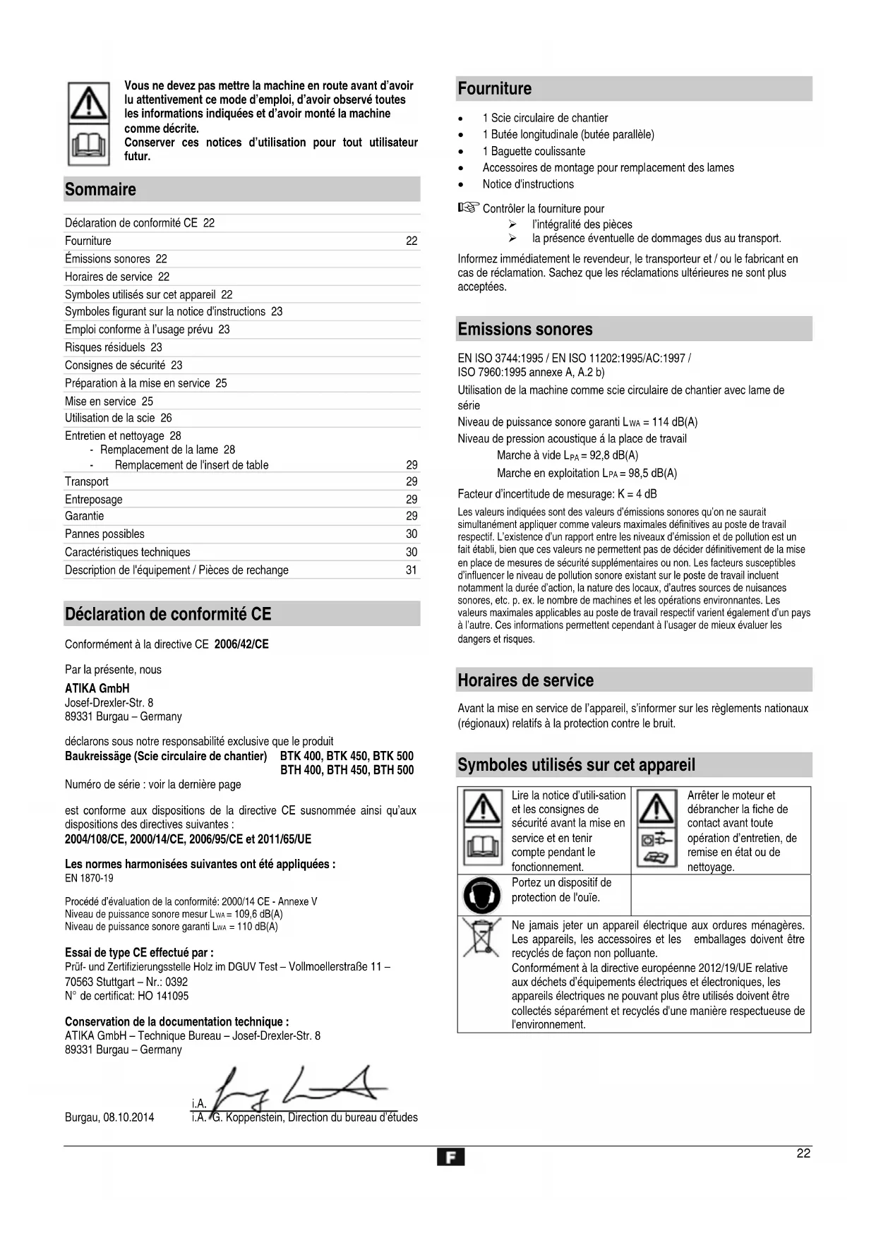 Déclaration de conformité CE Conformément à la directive CE 2006/42/CE Par la présente, nous ATIKA GmbH Josef-Drexler-Str. 8 89331 Burgau – Germany déclarons sous notre responsabilité exclusive que le produit Baukreissäge (Scie circulaire de chantier) BTK 400, BTK 450, BTK 500