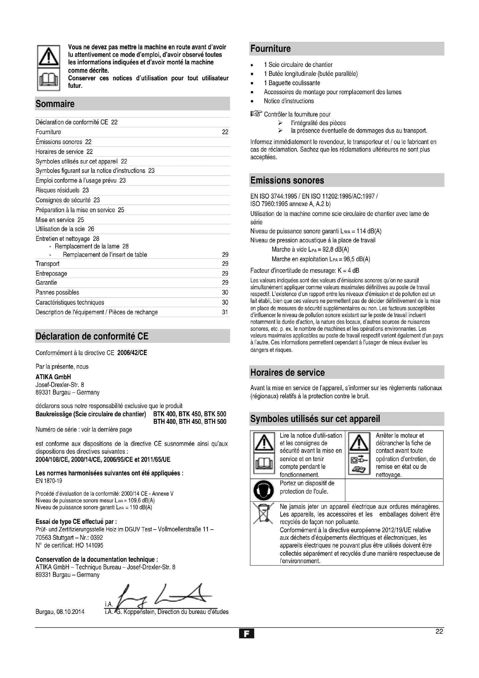 Déclaration de conformité CE Conformément à la directive CE 2006/42/CE Par la présente, nous ATIKA GmbH Josef-Drexler-Str. 8 89331 Burgau – Germany déclarons sous notre responsabilité exclusive que le produit Baukreissäge (Scie circulaire de chantier) BTK 400, BTK 450, BTK 500