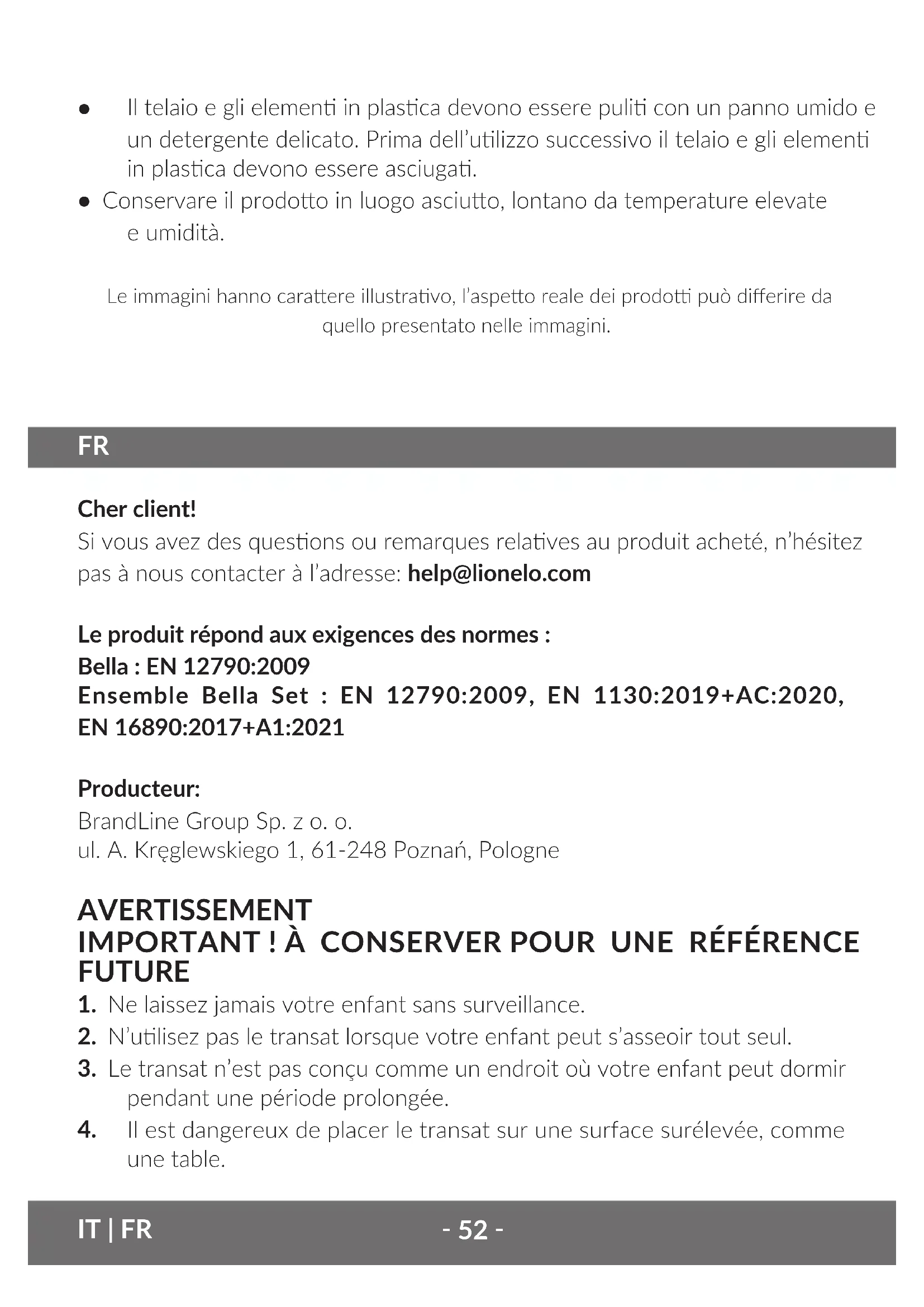 Cher client! Si vous avez des quesons ou remarques relaves au produit acheté, n’hésitez pas à nous contacter à l’adresse: help@lionelo.com Le produit répond aux exigences des normes : Bella : EN 12790:2009 Ensemble Bella Set : EN 12790:2009, EN 1130:2019+AC:2020, EN 16890:2017+A1:2021 Producteur: BrandLine Group Sp. z o. o. ul. A. Kręglewskiego 1, 61-248 Poznań, Pologne AVERTISSEMENT IMPORTANT ! À CONSERVER POUR UNE RÉFÉRENCE FUTURE