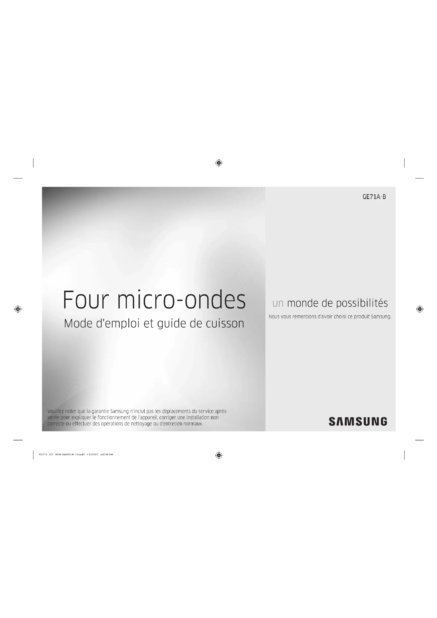 Four micro-ondes Mode d'emploi et guide de cuisson Veuillez noter que la garantie Samsung n'inclut pas les déplacements du service après- vente pour expliquer le fonctionnement de l'appareil, corriger une installation non correcte ou effectuer des opérations de nettoyage ou d'entretien normaux. un monde de possibilités Nous vous remercions d'avoir choisi ce produit Samsung. GE71A-B GE71A_XEF_DE68-04465B-00_FR.indd 1 5/2/2017 4:07:50 PMFrançais - 2 sommaire consignes de sécurité