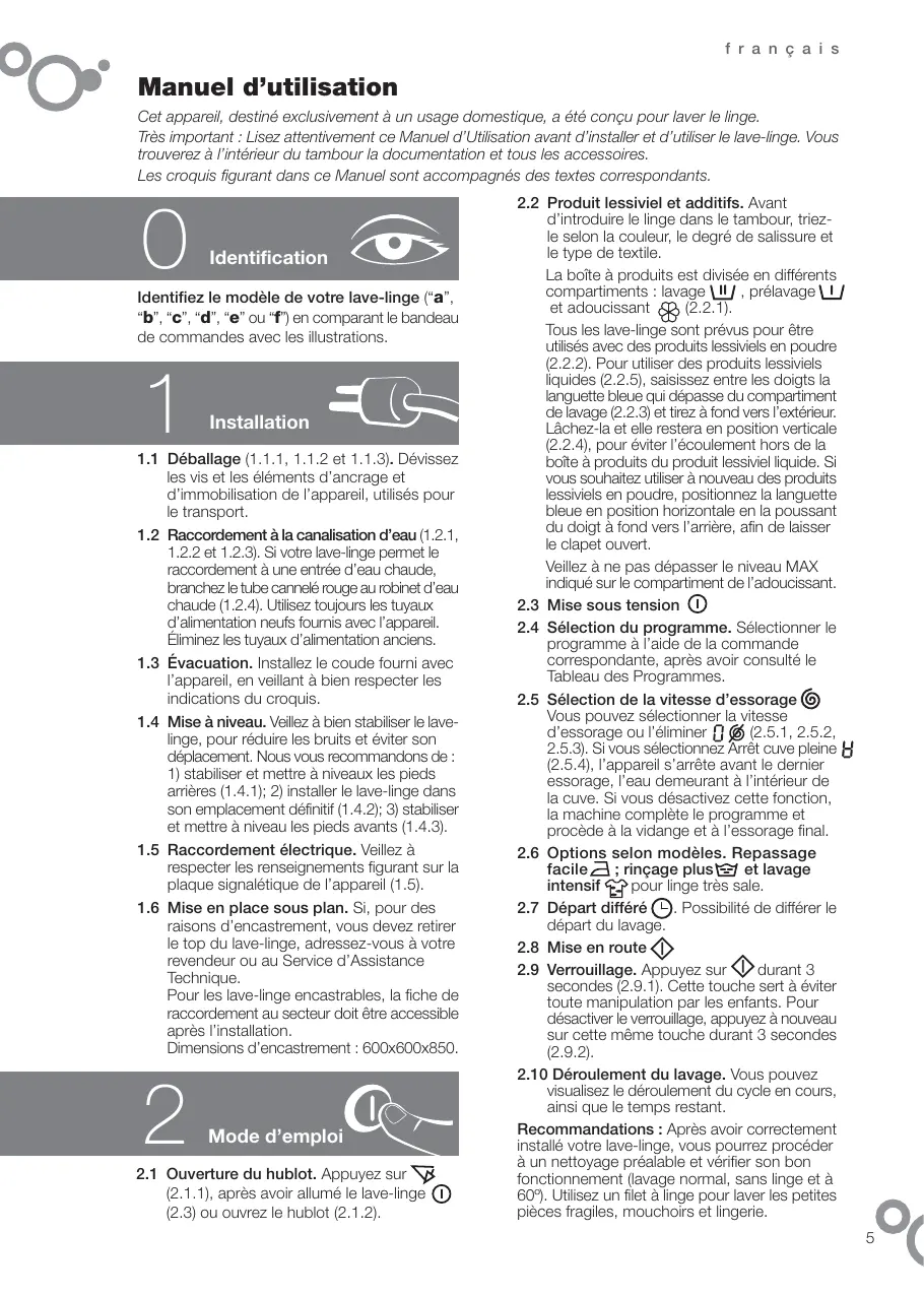 - programa para valoración de lavado y consumo de energía según norma EN60456, accionando tecla de lavado intensivo. f r a n ç a i s Manuel d’utilisation Cet appareil, destiné exclusivement à un usage domestique, a été conçu pour laver le linge. Très important : Lisez attentivement ce Manuel d’Utilisation avant d’installer et d’utiliser le lave-linge. Vous trouverez à l’intérieur du tambour la documentation et tous les accessoires. Les croquis figurant dans ce Manuel sont accompagnés des textes correspondants.