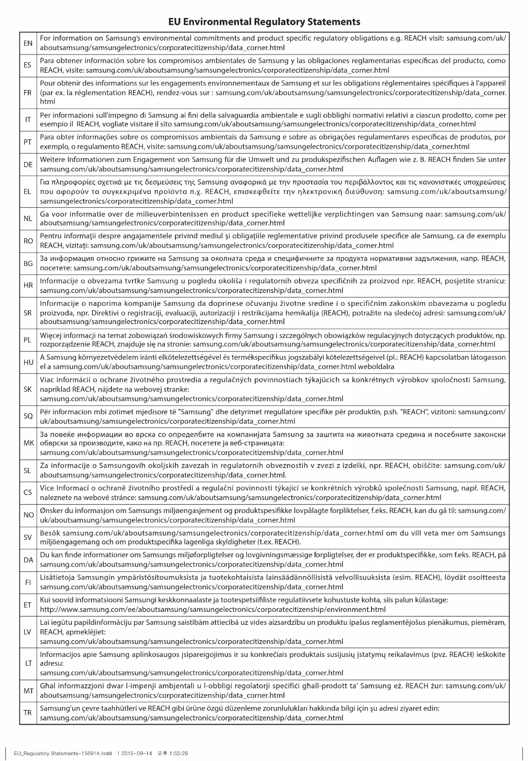 Pour obtenir des informations sur les engagements environnementaux de Samsung et sur les obligations réglementaires spéciques à l'appareil (par ex. la réglementation REACH), rendez-vous sur: samsung.com/uk/aboutsamsung/samsungelectronics/corporatecitizenship/data_corner. html