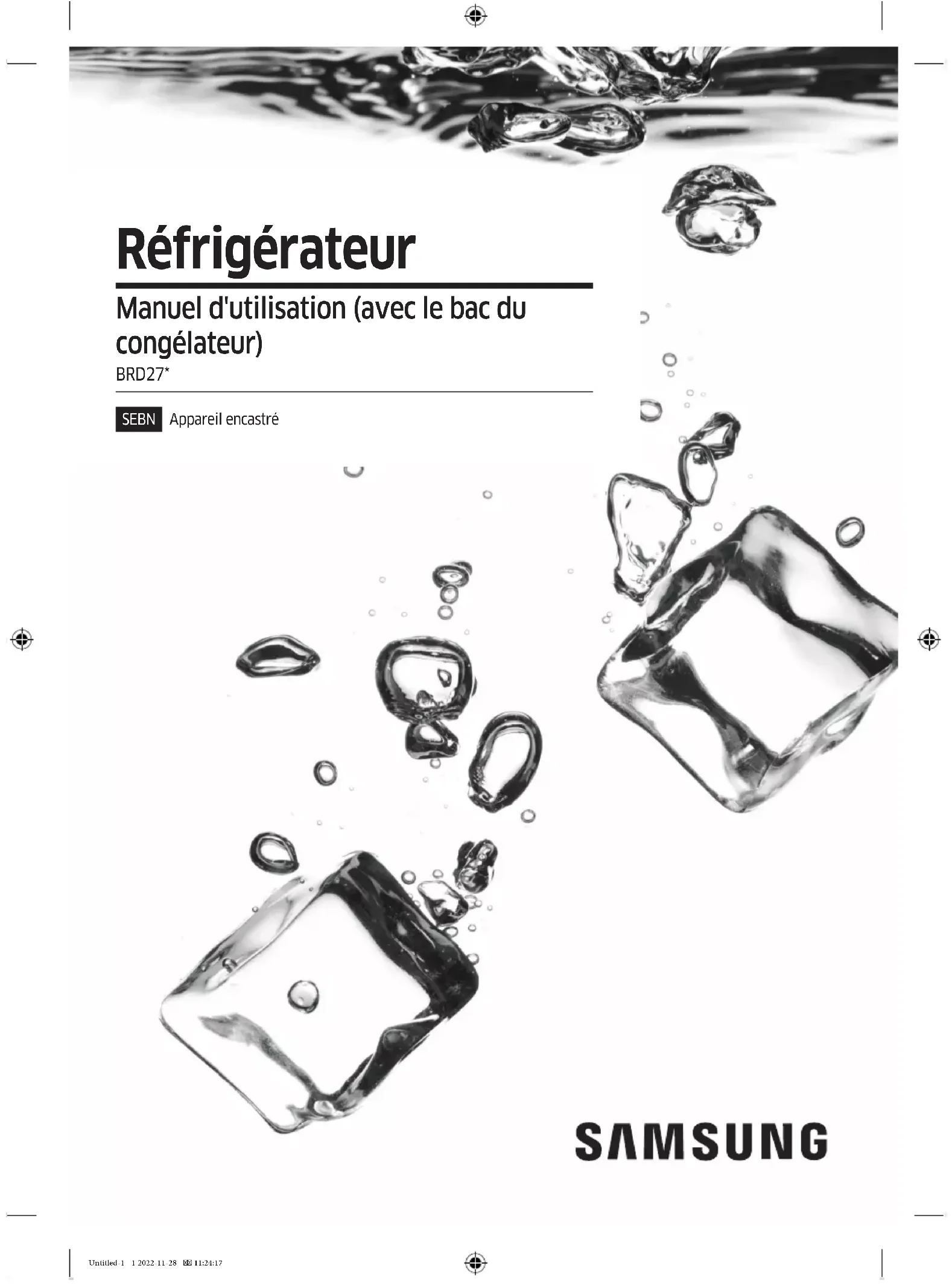 Réfrigérateur Manuel d'utilisation (avec le bac du congélateur) BRD27* SEBN Appareil encastré Untitled-1 1 2022-11-28 11:24:17Français2 Sommaire Sommaire Consignes de sécurité 3 Ce que vous devez savoir concernant les consignes de sécurité 3 Consignes de sécurité importantes et symboles : 6 Mesures importantes de sécurité 7 Symboles d'avertissement importants concernant le transport et le lieu d'installation de l'appareil 11 Avertissements importants concernant l'installation 11 Mises en garde concernant l'installation 16 Avertissements importants concernant l'utilisation 16 Mises en garde concernant l'utilisation 22 Nettoyage en toute sécurité 25 Avertissements importants concernant la mise au rebut 27 Conseils complémentaires pour une utilisation appropriée 28 Instructions concernant la règlementation DEEE 30 Installation 31 Présentation rapide du réfrigérateur 31 Installation étape par étape 32 Opérations 43 Panneau principal 43 SmartThings (modèles applicables uniquement) 47 Entretien 50 Utilisation et entretien 50 Nettoyage 52 Remplacement 52 Dépannage 53 Généralités 53 Entendez-vous des sons anormaux provenant du réfrigérateur ? 56 SmartThings (modèles applicables uniquement) 58