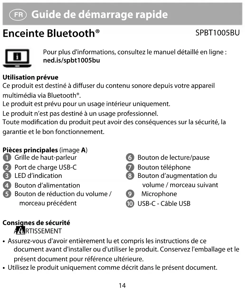 Guide de démarrage rapide Enceinte Bluetooth® SPBT1005BU Pour plus d'informations, consultez le manuel détaillé en ligne : ned.is/spbt1005bu Utilisation prévue Ce produit est destiné à diuser du contenu sonore depuis votre appareil multimédia via Bluetooth®. Le produit est prévu pour un usage intérieur uniquement. Le produit n’est pas destiné à un usage professionnel. Toute modication du produit peut avoir des conséquences sur la sécurité, la garantie et le bon fonctionnement. Pièces principales (image A) 1 Grille de haut-parleur 2 Port de charge USB-C 3 LED d’indication 4 Bouton d’alimentation 5 Bouton de réduction du volume / morceau précédent 6 Bouton de lecture/pause 7 Bouton téléphone 8 Bouton d’augmentation du volume / morceau suivant 9 Microphone q USB-C - Câble USB Consignes de sécurité