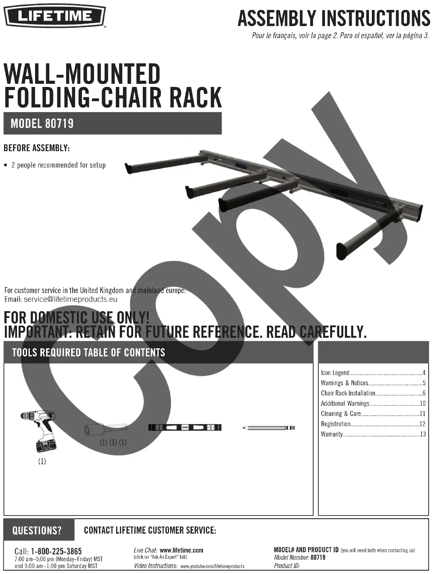 Composer le 1-800-225-3865Du lundi au vendredi 7 h – 17 h (HNR) et samedi 9 h – 13 h (HNR)t’Chat en direct: www.lifetime.com (cliquer sur la languette « Ask An Expert ») Vidéos éducatifs: www.youtube.com/lifetimeproducts QUESTIONS ? N° DE MODÈLE ET RÉFÉRENCE DU PRODUIT (vous aurez besoin des deux lorsque vous nous contactez) N° de modèle : 80719 Référence du produit :AVANT L’ASSEMBLAGE :• Nous recommandons 2 adultes pour l’assemblagePour les services à la clientèle au Royaume-Uni et du continent européen :Courriel: service@lifetimeproducts.eu