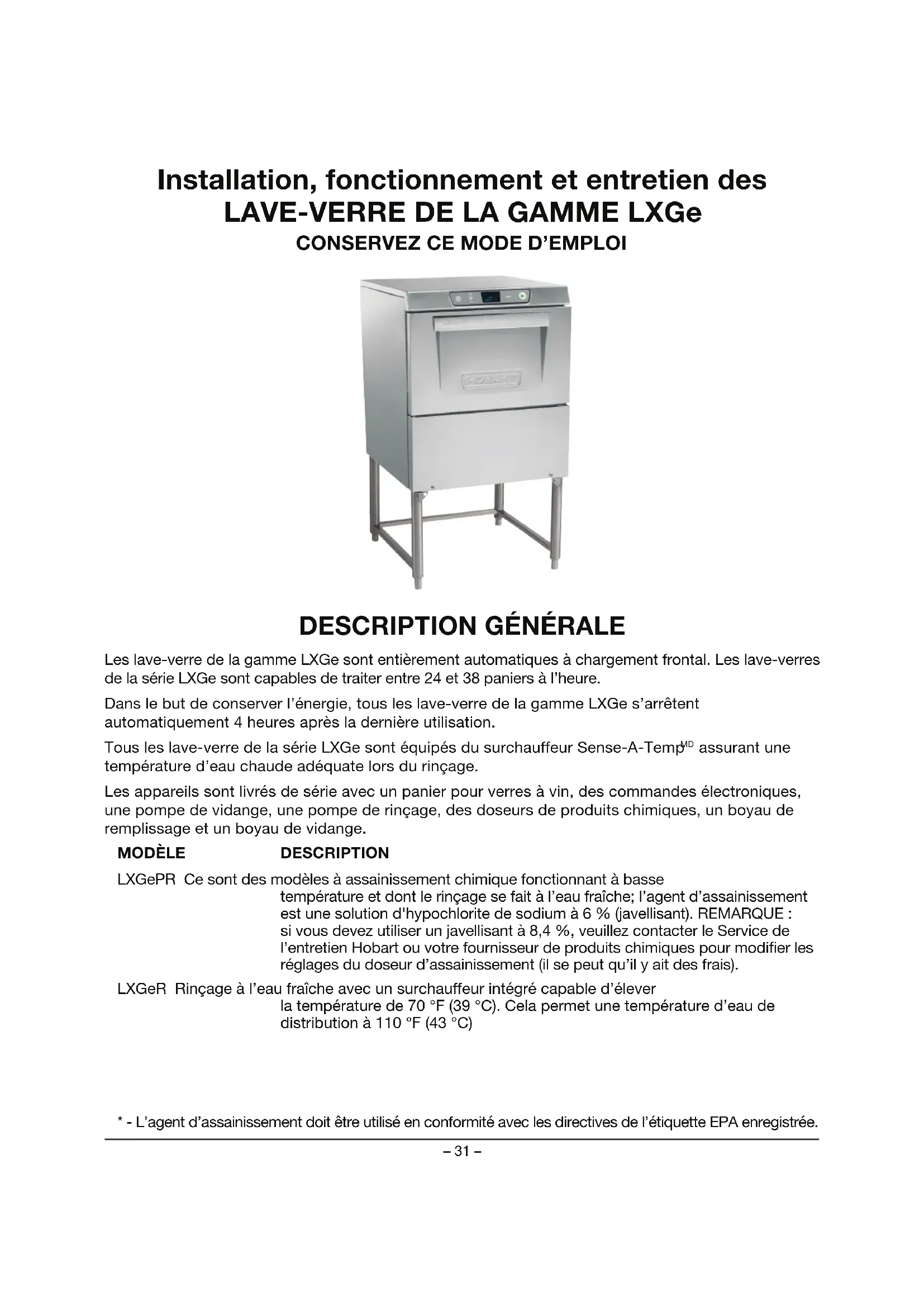 LXGePR Ce sont des modèles à assainissement chimique fonctionnant à basse température et dont le rinçage se fait à l’eau fraîche; l’agent d’assainissement est une solution d'hypochlorite de sodium à 6% (javellisant). REMARQUE: si vous devez utiliser un javellisant à 8,4%, veuillez contacter le Service de l’entretien Hobart ou votre fournisseur de produits chimiques pour modier les réglages du doseur d’assainissement (il se peut qu’il y ait des frais). LXGeR Rinçage à l’eau fraîche avec un surchauffeur intégré capable d’élever la température de 70°F (39°C). Cela permet une température d’eau de distribution à 110°F (43°C)
