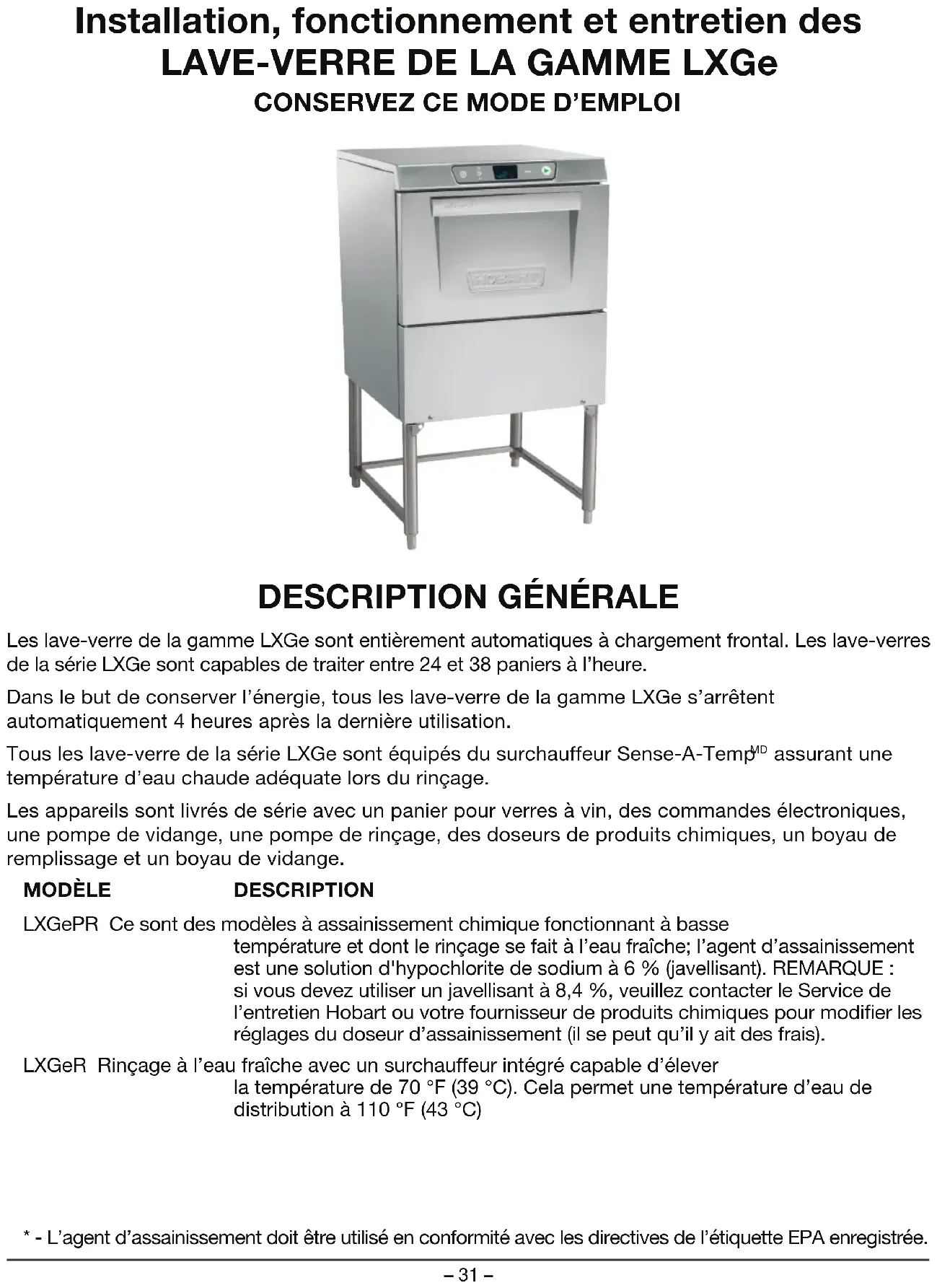 LXGePR Ce sont des modèles à assainissement chimique fonctionnant à basse température et dont le rinçage se fait à l’eau fraîche; l’agent d’assainissement est une solution d'hypochlorite de sodium à 6% (javellisant). REMARQUE: si vous devez utiliser un javellisant à 8,4%, veuillez contacter le Service de l’entretien Hobart ou votre fournisseur de produits chimiques pour modier les réglages du doseur d’assainissement (il se peut qu’il y ait des frais). LXGeR Rinçage à l’eau fraîche avec un surchauffeur intégré capable d’élever la température de 70°F (39°C). Cela permet une température d’eau de distribution à 110°F (43°C)