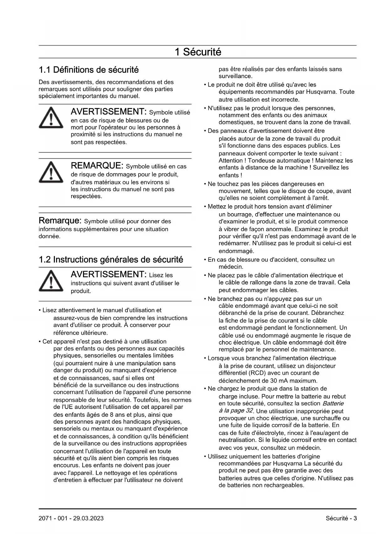 - Utilisez uniquement les batteries d'origine recommandées par Husqvarna La sécurité du produit ne peut pas être garantie avec des batteries autres que celles d'origine. N'utilisez pas de batteries non rechargeables. 2071 - 001 - 29.03.2023 Sécurité - 3• Pour suivre les instructions d'installation qui expliquent notamment comment définir la zone de travail, reportez-vous à Installation à la page 11