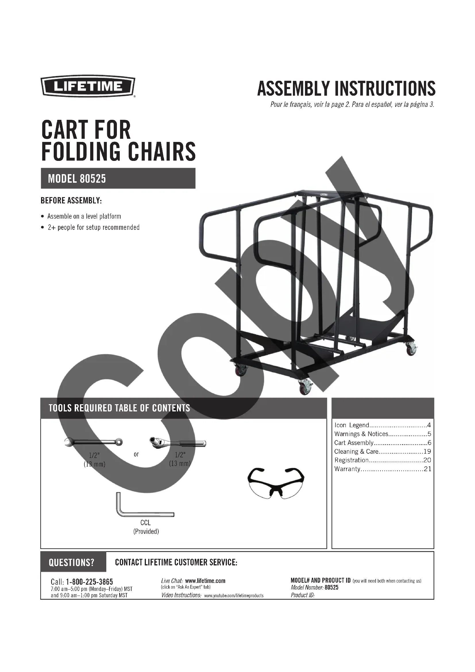 - Dans l’éventualité improbable d’un rappel ou d’un avis de sécurité, votre inscription fournit les renseignements nécessaires nous permettant de communiquer avec vous.• L’inscription est rapide, facile et complètement volontaire. Conserver votre confi dentialité est notre politique de longue date chez Lifetime®. Vous pouvez donc être rassuré par le fait que Lifetime® ne vendra pas ou ne fournira pas vos données personnelles à des tiers, et ne leur permettra pas d’utiliser vos données personnelles à leurs propres fi ns. ENREGISTREZ VOTRE PRODUIT EN LIGNE À WWW.LIFETIME.COM21 CART ASSEMBLY / ASSEMBLAGE DU CHARIOT / ENSAMBLE DE LA CARRETILLA
