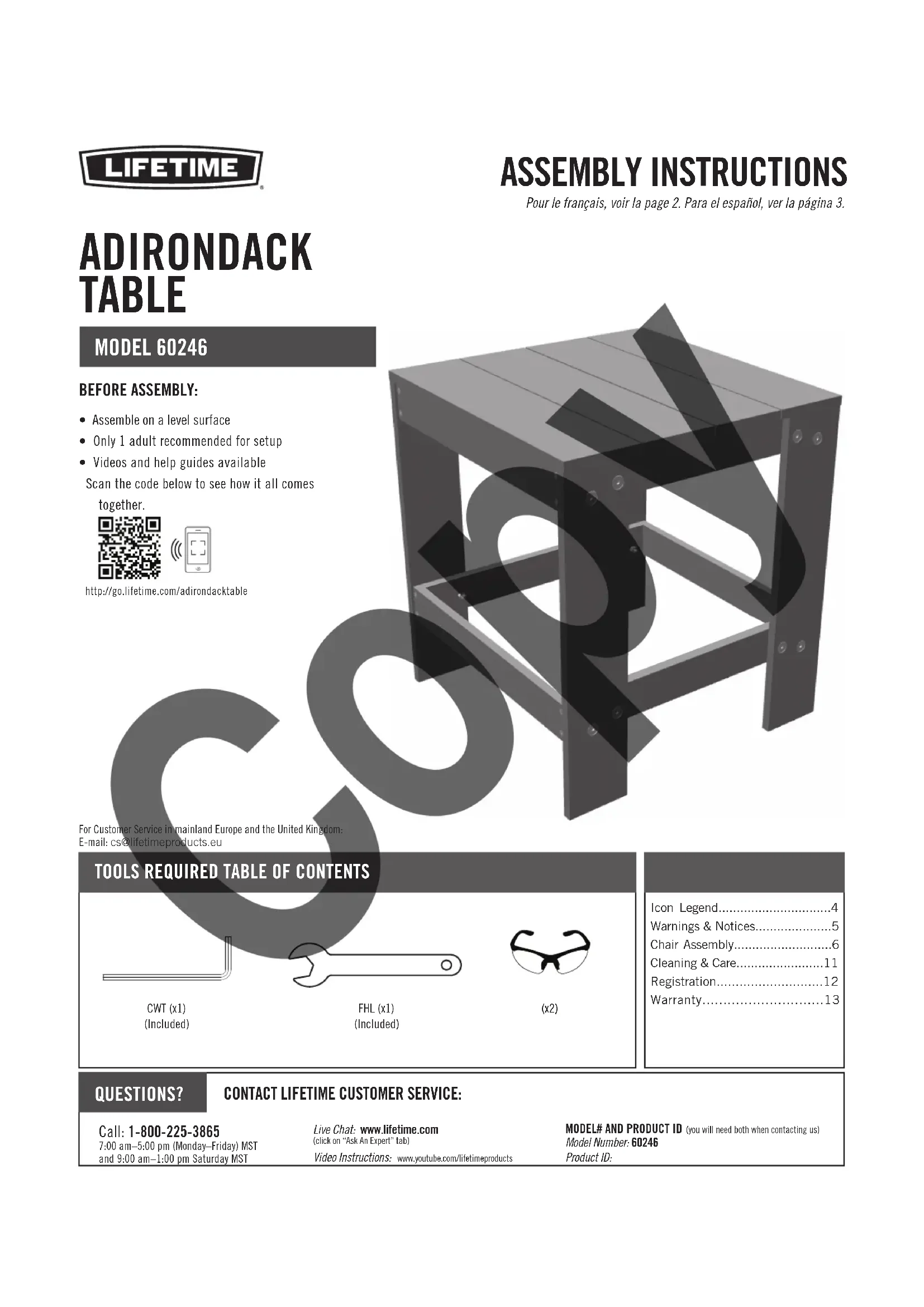 - Assembler sur une surface de niveau• Nous recommendons seulement 1 adulte pour l’assemblage• Vídeos et guides d’aide sont disponibles Scanner le code ci-dessous pour voir l’assemblage. http://go.lifetime.com/adirondacktableFor English, see page 1. Para el español, ver la página 3.
