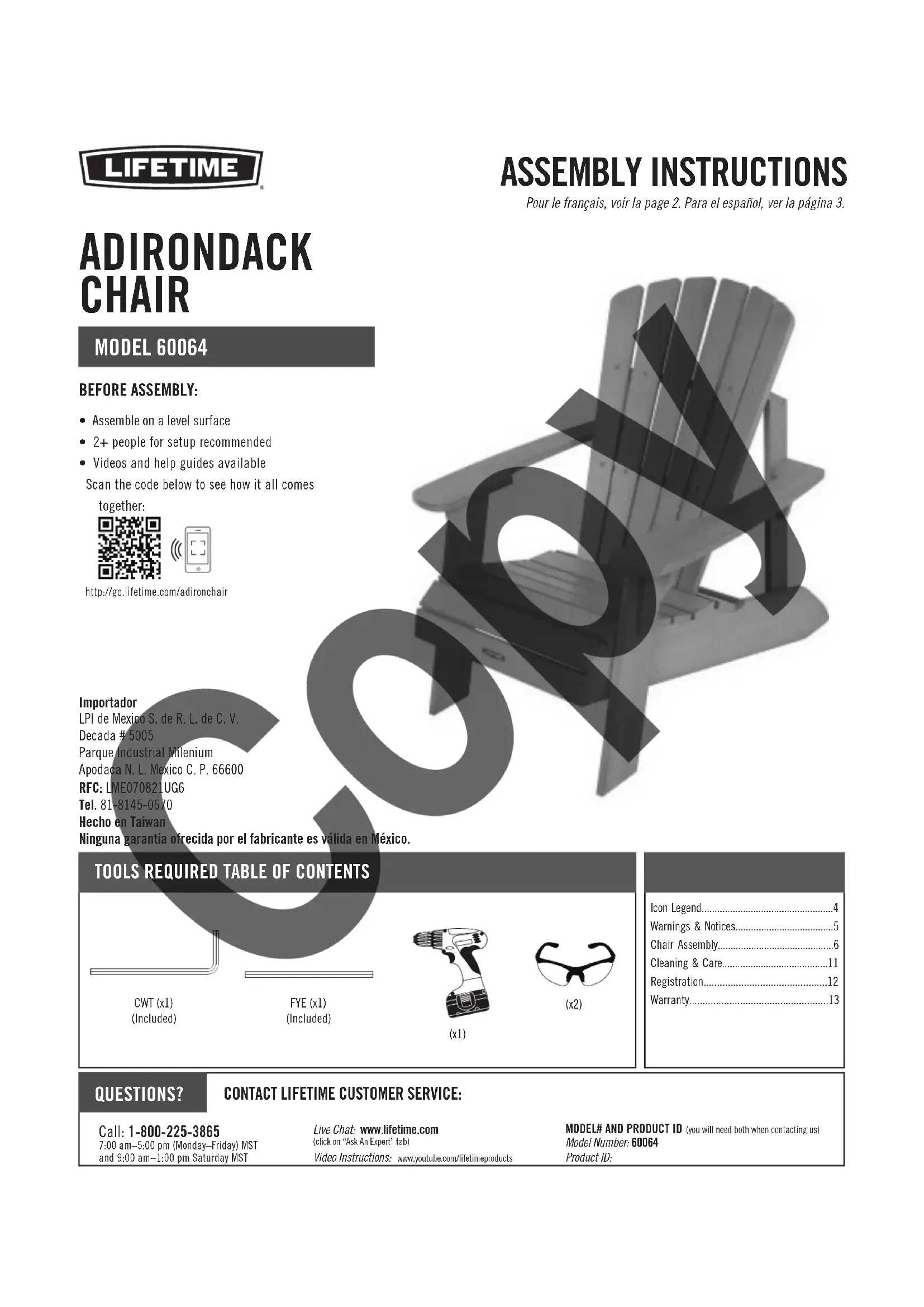 - Assembler sur une surface de niveau• Nous recommendons 2+ adultes pour l’assemblage• Vídeos et guides d’aide sont disponibles Scanner le code ci-dessous pour voir l’assemblage: http://go.lifetime.com/adironchairFor English, see page 1. Para el español, ver la página 3.