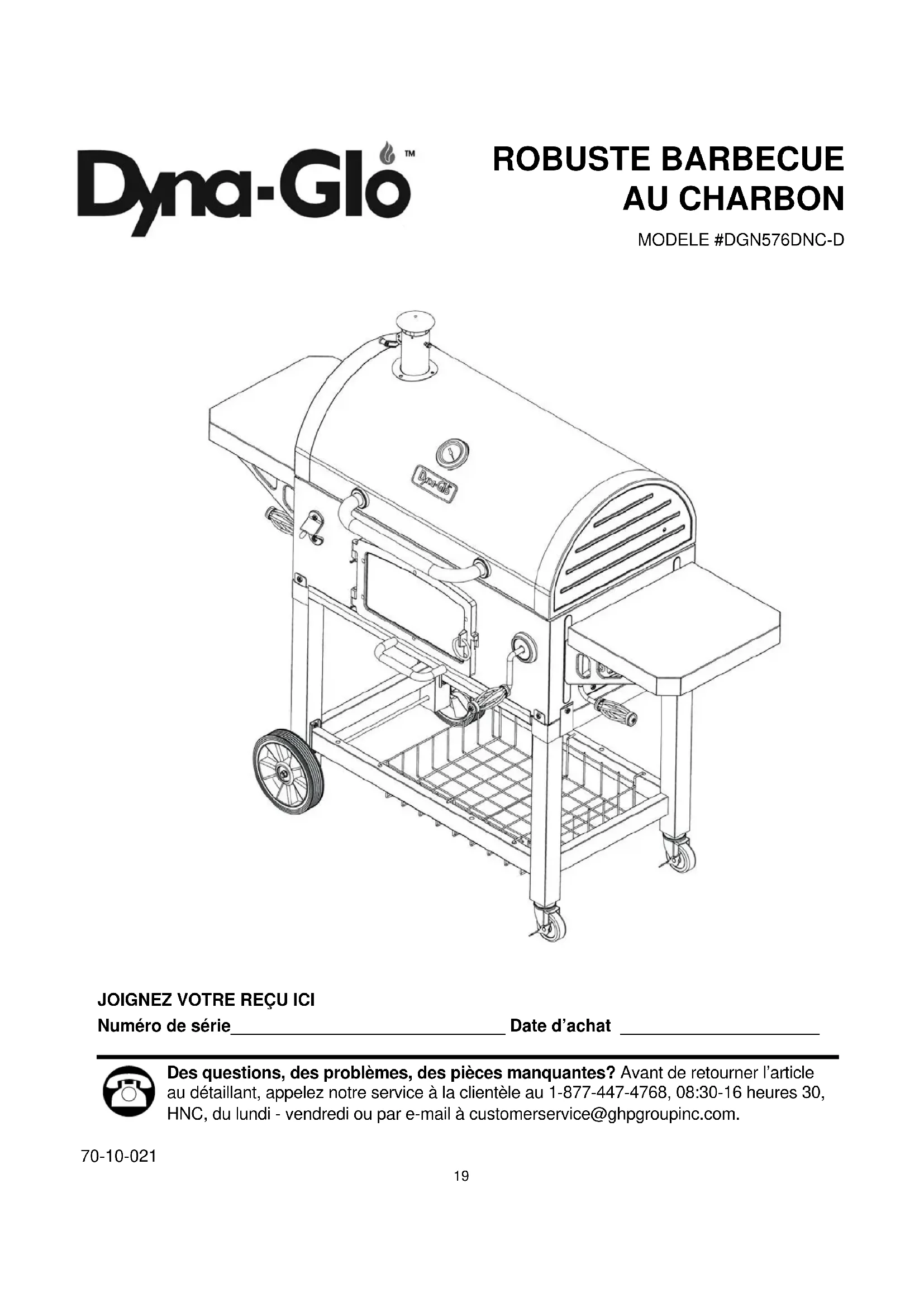 - Ajustez le débit d’air de la cheminée en tirant la poignée dans le sens opposé de la cheminée et en baissant ou en levant la poignée jusqu’à l’obtention du débit d’air désiré. Cuisson Nous recommandons le charbon. Toutefois, le bois ou une combinaison des deux peut être utilisé comme combustible. Il faut placer ces matières combustibles sur le plateau avant de les allumer. Ne faites pas un trop gros feu. Nous recommandons de ne pas utiliser plus de 1,8 kg (environ 60 briquettes) et d’en ajouter d’autres au besoin lors de la cuisson. Placez les grilles de cuisson dans l’appareil avec des gants résistant à la chaleur lorsque le feu s’est éteint. Des blessures graves et/ ou des dommages matériels peuvent survenir si l’on ne suit pas les instructions sur l’allumage du charbon. Avertissement . La plupart des surfaces de l’appareil sont chaudes lors de l’utilisation. Soyez excessivement prudent . Ne laissez pas les personnes s’y approcher. . Portez des vêtements de protection pour empêcher les blessures. . Ne laissez pas les enfants et les animaux s’approcher. . NE DÉPLACEZ PAS l’appareil durant son utilisation. . Ne remplacez jamais l’allume-barbecue pour le charbon par de l’essence, du kérosène ou de l’alcool. La loi interdit dans certains États l’utilisation d’allume-barbecue pour le charbon. Dans ce cas, l’allume-barbecue en cube à la parafne peu être utilisé au lieu d’un allume-barbecue pour le charbon . N’utilisez jamais un allume-barbecue liquide pour le charbon avec un allumeur électrique.34 Garantie limitée de 1 an Ce barbecue est garanti 1 an contre les pièces cassées ou endommagées au moment de l'achat. Il est garanti exempt de défauts. La peinture est garanti exempt de défauts à l'exception de la rouille, qui apparaissent après un usage répété peut. Cette garantie ne couvre pas les dommages ou les questions liées à la négligence, l'abus, ou des modications à l'appareil. Les travaux de réparation ne sont pas couverts. Toutes les pièces qui répondent aux exigences de garantie seront expédiés sans frais via la discrétion des GHP Group, Inc (expédition par voie terrestre, Mail États-Unis, ou par la poste SEULEMENT). Tous les frais de manutention spéciales (c.-à-deuxième jour, la nuit, etc) seront à la charge du consommateur. Toutes les réclamations de garantie sont valables uniquement à l'acheteur original et nécessitent une preuve de la date d'achat d'achat de vérication. Ce service est disponible en composant le numéro sans frais 1-877-447-4768, 08:30-16 heures et demie HNC, du lundi - vendredi. AVIS: Certains états ne permettent pas l'exclusion ou la limitation accidentels ou consécutifs de limitations sur les dommages ou la durée d'une garantie implicite, les exclusions ou limitations ci-dessus peuvent ne pas s'appliquer à vous. Cette garantie vous donne des droits légaux spéciques et vous pouvez avoir d'autres droits légaux qui peuvent varier également d'un État à État. Fabriqué par: GHP Group Inc 8280 Austin Avenue Morton Grove, IL, USA 60053-3207 Nom d'article: ROBUSTE BARBECUE AU CHARBON Modèle #: DGN576DNC-D