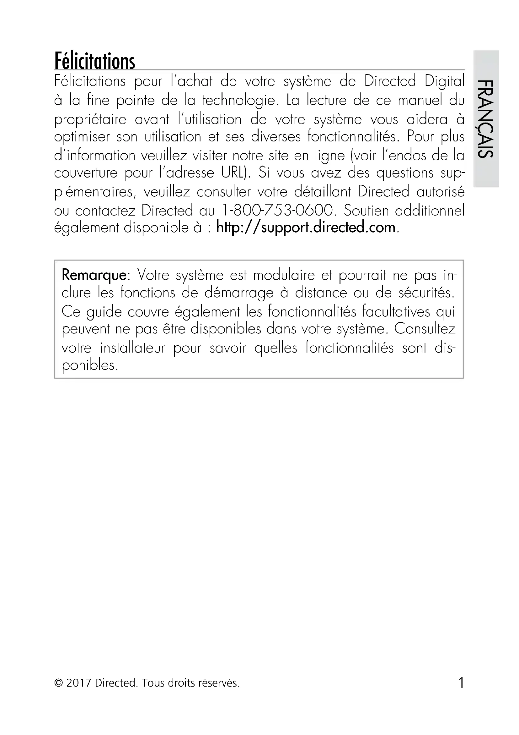 - Manuel d’utilisation © 2017 Directed, Vista, CA QRG7116 2017-10 FailSafe®, Learn Routine™, Silent Mode™, Valet® et Warn Away® sont des marques commerciales ou des marques déposées appartenant à Directed®.Table des matières Félicitations p. 1
