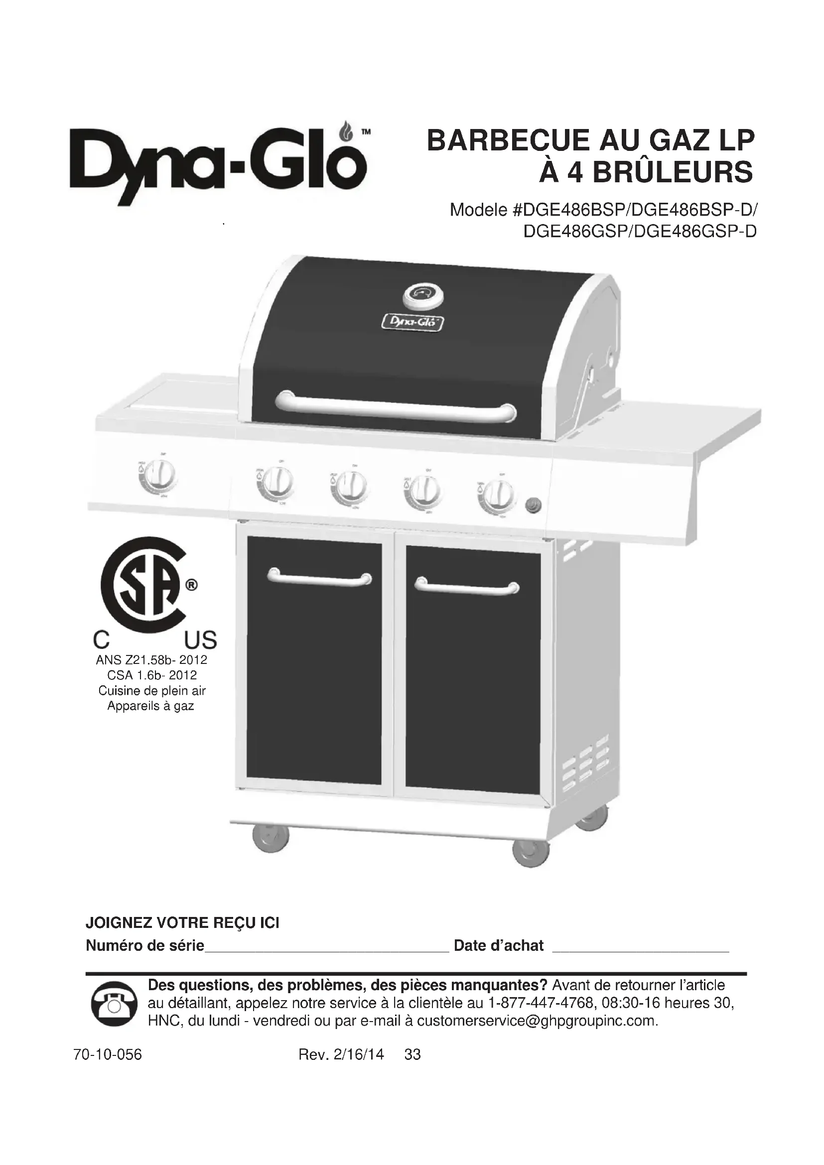 Numéro de série_____________________________ Date d’achat _____________________ Des questions, des problèmes, des pièces manquantes? Avant de retourner l’article au détaillant, appelez notre service à la clientèle au 1-877-447-4768, 08:30-16 heures 30, HNC, du lundi - vendredi ou par e-mail à customerservice@ghpgroupinc.com. ANS Z21.58b- 2012 CSA 1.6b- 2012 Cuisine de plein air Appareils à gaz Modele #DGE486BSP/DGE486BSP-D/