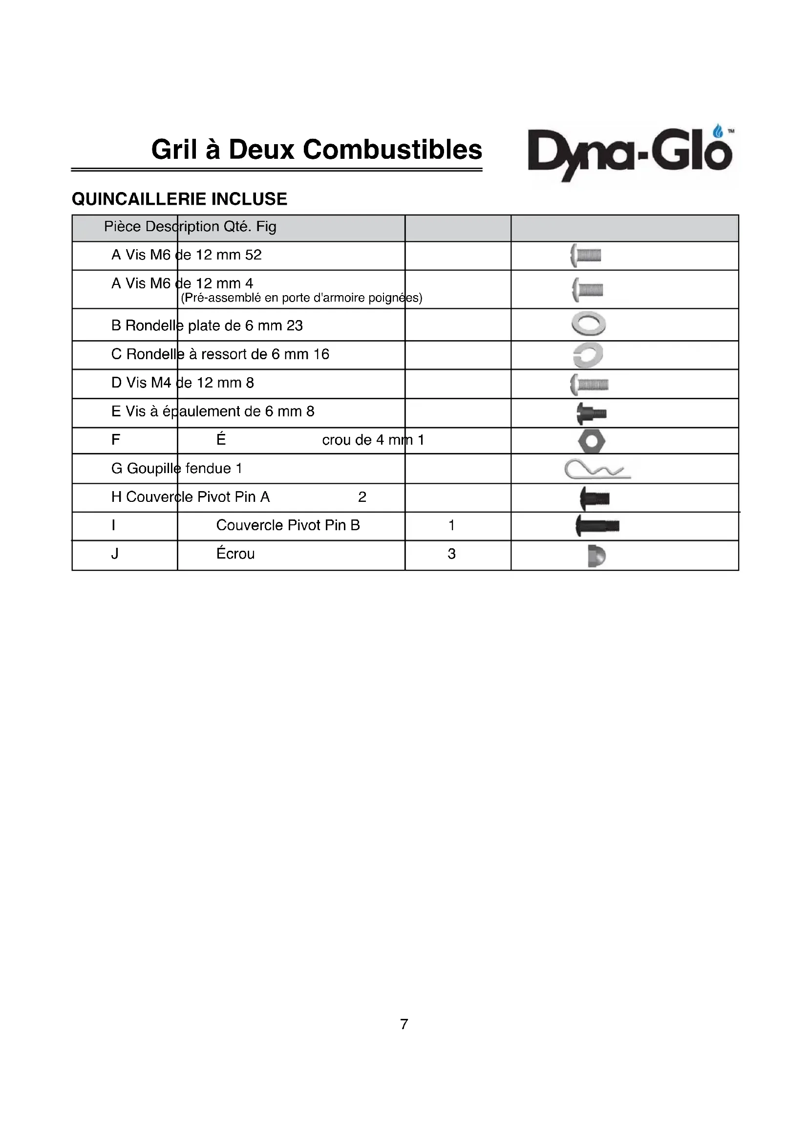 Outils nécessaires pour le déballage, l’assemblage et la vérification des fuites de ce produit1:7 QUINCAILLERIE INCLUSE Pièce Description Qté. Fig A Vis M6 de 12 mm 52 A Vis M6 de 12 mm 4 (Pré-assemblé en porte d'armoire poignées) B Rondelle plate de 6 mm 23 C Rondelle à ressort de 6 mm 16 D Vis M4 de 12 mm 8 E Vis à épaulement de 6 mm 8 FÉcrou de 4 mm 1 G Goupille fendue 1 H Couvercle Pivot Pin A 2 I Couvercle Pivot Pin B 1 JÉcrou 3 Gril à Deux CombustiblesQuincaillerie utilisée A Vis M6 de 12 mm Qté: 16 pcs B Rondelle plate de 6 mm Qté: 16 pcs C Rondelle à ressort de 6 mm Qté: 16 pcs