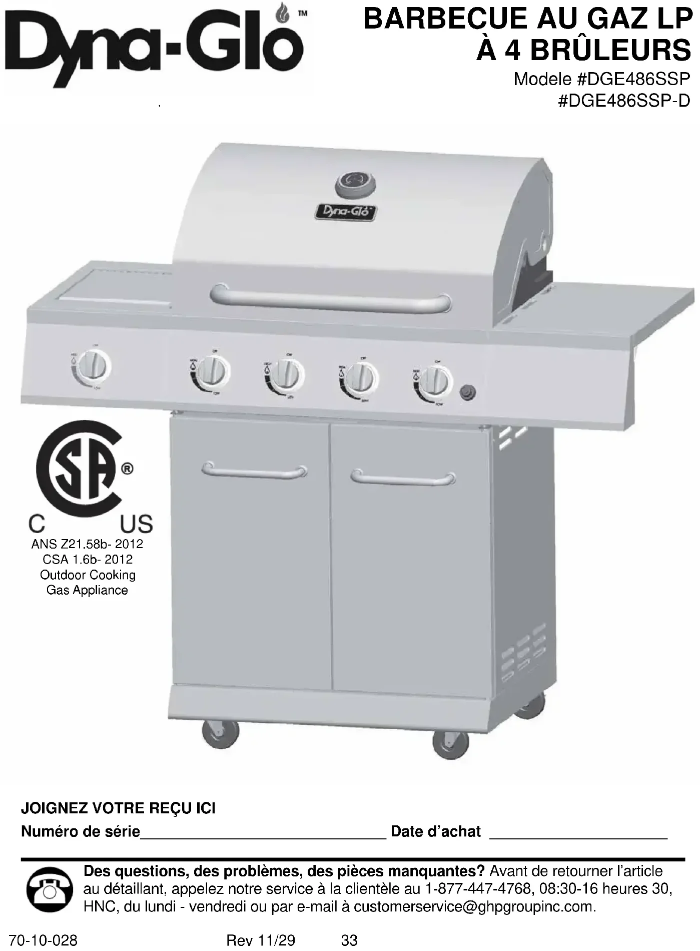 Numéro de série_____________________________ Date d’achat _____________________ Des questions, des problèmes, des pièces manquantes? Avant de retourner l’article au détaillant, appelez notre service à la clientèle au 1-877-447-4768, 08:30-16 heures 30, HNC, du lundi - vendredi ou par e-mail à customerservice@ghpgroupinc.com. ANS Z21.58b- 2012 CSA 1.6b- 2012 Outdoor Cooking Gas Appliance34