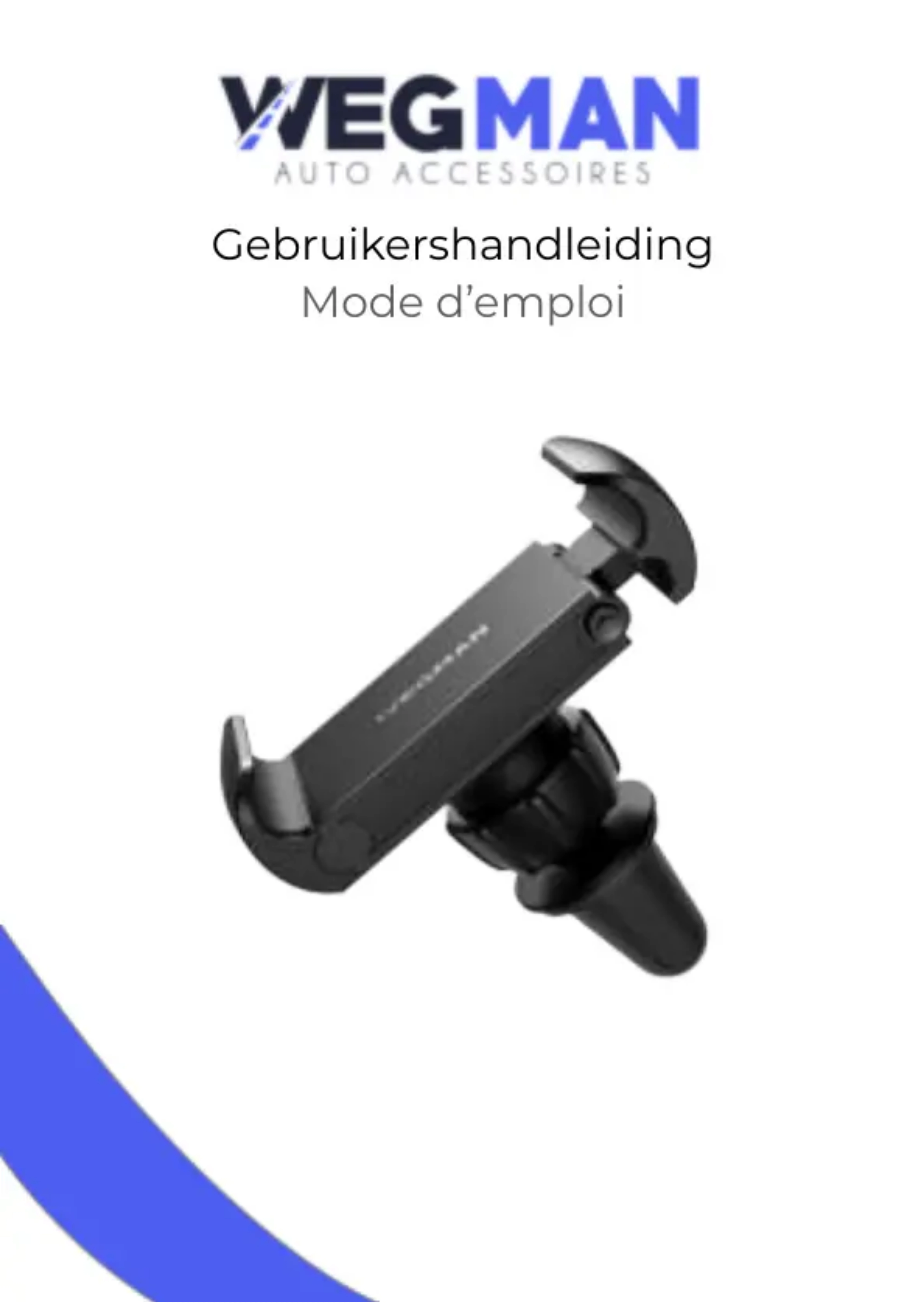Gebruikershandleiding Mode d’emploi! Zet de telefoonklem en de roosterclip in elkaar - Assemblez la pince de téléphone et le clip de grille Steek eerst de kogel in de moer en steek hem dan in de bout aan de achterkant van de telefoonhouder, draai daarna de moer vast. " Insérez d'abord la bille dans l'écrou, puis dans le boulon situé à l'arrière du support du téléphone, ensuite serrez l'écrou. Eerste installatie - Première installation Plaats je telefoon in de klem - Placez votre téléphone dans la pince De makkelijkste manier om je telefoon vast te klemmen is door de zijkant van de telefoon tegen het beweegbare stuk van de klem te duwen." La façon la plus facile de fixer votre téléphone est de pousser le côté du téléphone contre la partie mobile de la pince.! Plaats de houder in het ventilatierooster - Placez le support dans la grille de ventilation Schuif de siliconen clip van de houder zo diep mogelijk in het ventilatierooster, totdat de houder stevig vast zit." Faites glisser le clip en silicone le plus profondément possible dans la grille de ventilation, jusqu'à ce que le support soit fermement en place. Positie van de telefoon - Positionner le téléphone Roteer de kop van de houder - Faites tourner la tête du support Dankzij de kogel, kan je de telefoonklem in alle mogelijke richtingen bewegen. Plaats je telefoon horizontaal of verticaal en kantel het scherm naar boven of onder voor de beste kijkhoek." Grâce à la bille, vous pouvez tourner la pince du téléphone dans toutes les directions possibles. Placez votre téléphone à l'horizontale ou à la verticale et inclinez l'écran vers le haut ou le bas pour obtenir le meilleur angle de vue.De telefoon uit de klem verwijderen - Enlever le téléphone de la pince De makkelijkste manier om je telefoon uit de klem te halen is door de zijkant van de telefoon tegen het beweegbare stuk van de klem te duwen." La façon la plus facile d’enlever le téléphone de la pince est de pousser le côté du téléphone contre la partie mobile. De telefoon verwijderen - Enlever le téléphone De houder verwijderen - Détacher le support Om de houder uit de auto te verwijderen, schuif je de siliconen clip uit het ventilatierooster. De telefoonklem hoef je niet telkens van de siliconen clip los te maken." Pour retirer le support de la voiture, faites glisser le clip en silicone hors de la grille de ventilation. Il n’est pas nécessaire de détacher à chaque fois la pince du téléphone du clip en silicone.