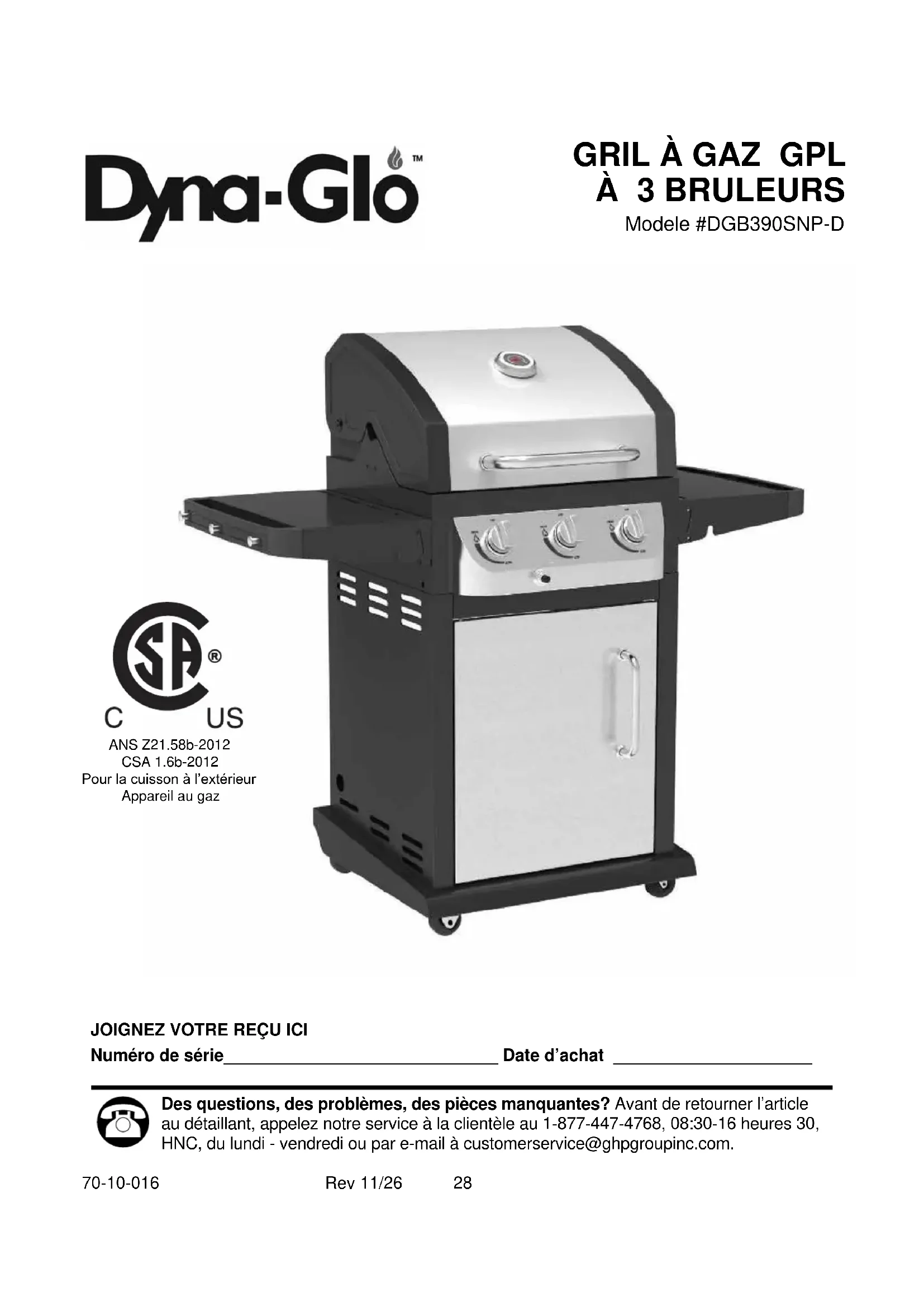 70-10-016 Rev 11/26 GriL à GaZ GPL à 3 BruLeurs Modele #DGB390SNP-D ANS Z21.58b-2012 CSA 1.6b-2012 Pour la cuisson à l’extérieur Appareil au gaz