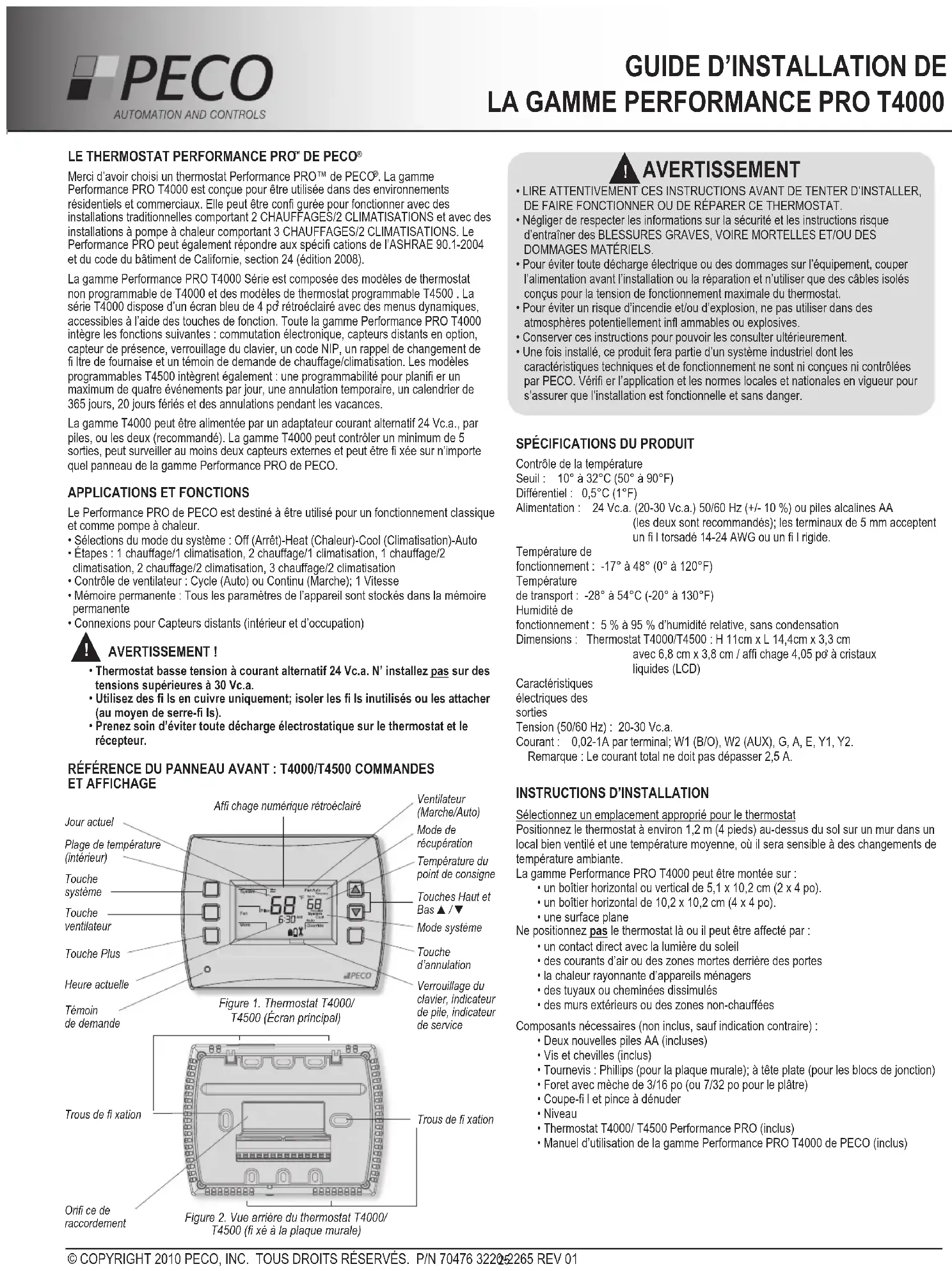 Merci d’avoir choisi un thermostat Performance PRO™ de PECO . La gamme Performance PRO T4000 est conçue pour être utilisée dans des environnements résidentiels et commerciaux. Elle peut être con gurée pour fonctionner avec des installations traditionnelles comportant 2 CHAUFFAGES/2 CLIMATISATIONS et avec des installations à pompe à chaleur comportant 3 CHAUFFAGES/2 CLIMATISATIONS. Le Performance PRO peut également répondre aux spéci cations de l’ASHRAE 90.1-2004et du code du bâtiment de Californie, section 24 (édition 2008).La gamme Performance PRO T4000 Série est composée des modèles de thermostat non programmable de T4000 et des modèles de thermostat programmable T4500 . La série T4000 dispose d’un écran bleu de 4 po rétroéclairé avec des menus dynamiques, accessibles à l’aide des touches de fonction. Toute la gamme Performance PRO T4000 intègre les fonctions suivantes : commutation électronique, capteurs distants en option, capteur de présence, verrouillage du clavier, un code NIP, un rappel de changement de ltre de fournaise et un témoin de demande de chauffage/climatisation. Les modèles programmables T4500 intègrent également : une programmabilité pour plani er un maximum de quatre événements par jour, une annulation temporaire, un calendrier de365 jours, 20 jours fériés et des annulations pendant les vacances.La gamme T4000 peut être alimentée par un adaptateur courant alternatif 24 Vc.a., par piles, ou les deux (recommandé). La gamme T4000 peut contrôler un minimum de 5 sorties, peut surveiller au moins deux capteurs externes et peut être xée sur n’importe quel panneau de la gamme Performance PRO de PECO.Le Performance PRO de PECO est destiné à être utilisé pour un fonctionnement classique et comme pompe à chaleur.• Sélections du mode du système : Off (Arrêt)-Heat (Chaleur)-Cool (Climatisation)-Auto• Étapes : 1 chauffage/1 climatisation, 2 chauffage/1 climatisation, 1 chauffage/2 climatisation, 2 chauffage/2 climatisation, 3 chauffage/2 climatisation• Contrôle de ventilateur : Cycle (Auto) ou Continu (Marche); 1 Vitesse• Mémoire permanente : Tous les paramètres de l’appareil sont stockés dans la mémoire permanente• Connexions pour Capteurs distants (intérieur et d’occupation)• • • Contrôle de la températureSeuil : 10° à 32°C (50° à 90°F)Différentiel : 0,5°C (1°F)Alimentation : 24 Vc.a. (20-30 Vc.a.) 50/60 Hz (+/- 10 %) ou piles alcalines AA (les deux sont recommandés); les terminaux de 5 mm acceptent un l torsadé 14-24 AWG ou un l rigide.Température defonctionnement : -17° à 48° (0° à 120°F)Températurede transport : -28° à 54°C (-20° à 130°F)Humidité defonctionnement : 5 % à 95 % d’humidité relative, sans condensationDimensions : Thermostat T4000/T4500 : H 11cm x L 14,4cm x 3,3 cmavec 6,8 cm x 3,8 cm / af chage 4,05 po à cristauxliquides (LCD)Caractéristiquesélectriques dessortiesTension (50/60 Hz) : 20-30 Vc.a. Courant : 0,02-1A par terminal; W1 (B/O), W2 (AUX), G, A, E, Y1, Y2. Remarque : Le courant total ne doit pas dépasser 2,5 A.Sélectionnez un emplacement approprié pour le thermostatPositionnez le thermostat à environ 1,2 m (4 pieds) au-dessus du sol sur un mur dans un local bien ventilé et une température moyenne, où il sera sensible à des changements de température ambiante.La gamme Performance PRO T4000 peut être montée sur :• un boîtier horizontal ou vertical de 5,1 x 10,2 cm (2 x 4 po).• un boîtier horizontal de 10,2 x 10,2 cm (4 x 4 po).• une surface planeNe positionnez le thermostat là ou il peut être affecté par :• un contact direct avec la lumière du soleil• des courants d’air ou des zones mortes derrière des portes• la chaleur rayonnante d’appareils ménagers• des tuyaux ou cheminées dissimulés• des murs extérieurs ou des zones non-chauffées Composants nécessaires (non inclus, sauf indication contraire) :• Deux nouvelles piles AA (incluses)• Vis et chevilles (inclus)• Tournevis : Phillips (pour la plaque murale); à tête plate (pour les blocs de jonction)• Foret avec mèche de 3/16 po (ou 7/32 po pour le plâtre)• Coupe- l et pince à dénuder• Niveau• Thermostat T4000/ T4500 Performance PRO (inclus)• Manuel d’utilisation de la gamme Performance PRO T4000 de PECO (inclus)