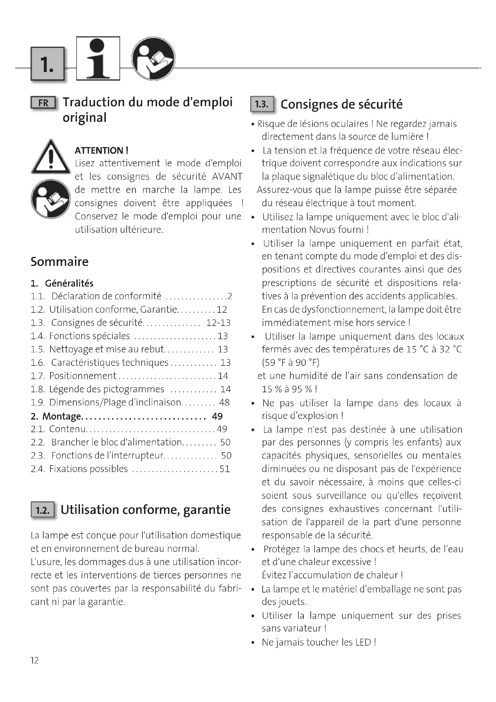 Utilisation conforme, garantie La lampe est conçue pour l'utilisation domestique et en environnement de bureau normal. L'usure, les dommages dus à une utilisation incor- recte et les interventions de tierces personnes ne sont pas couvertes par la responsabilité du fabri- cant ni par la garantie.