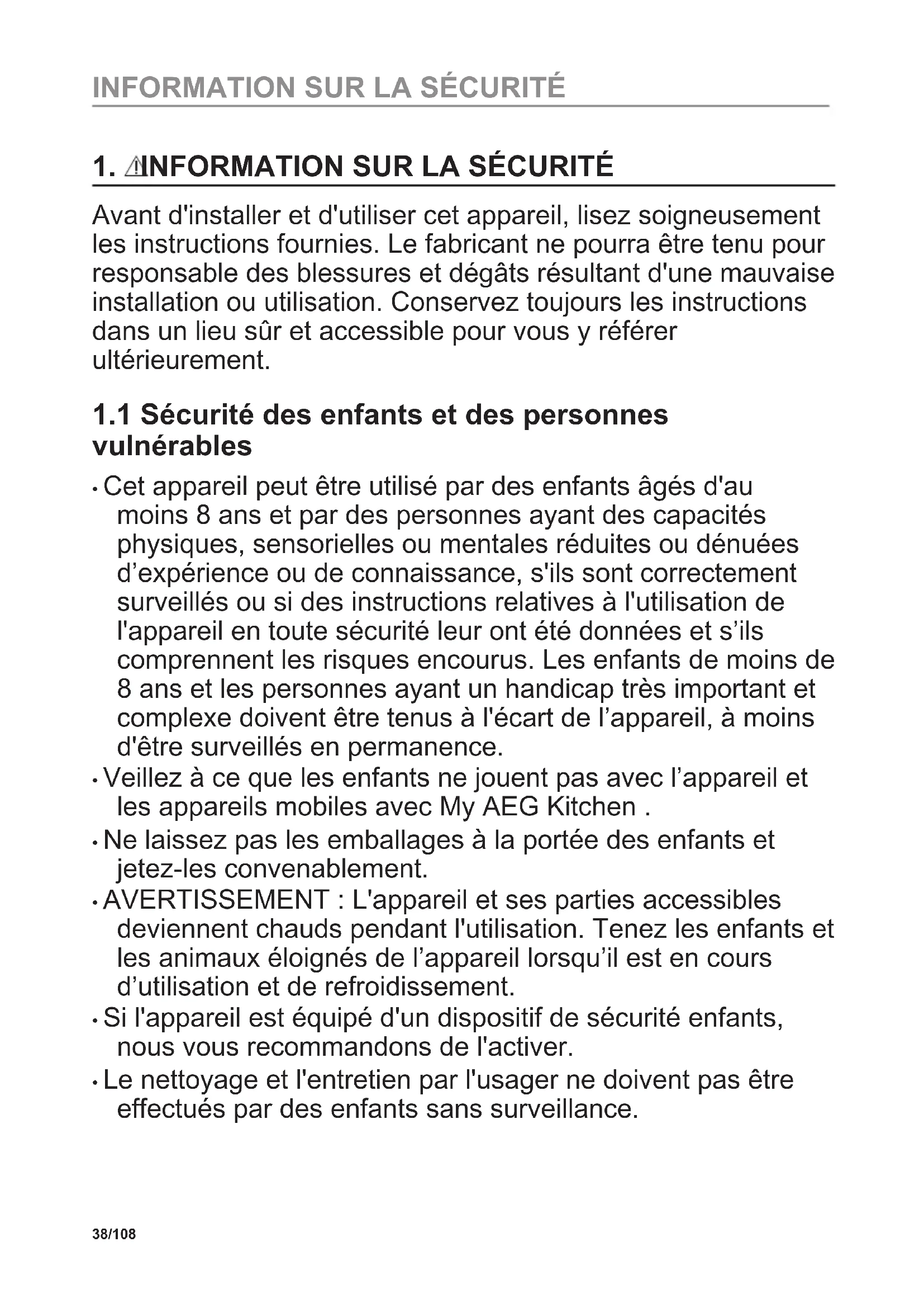 - Le nettoyage et l'entretien par l'usager ne doivent pas être effectués par des enfants sans surveillance. 38/108 INFORMATION SUR LA SÉCURITÉ1.2 Sécurité générale