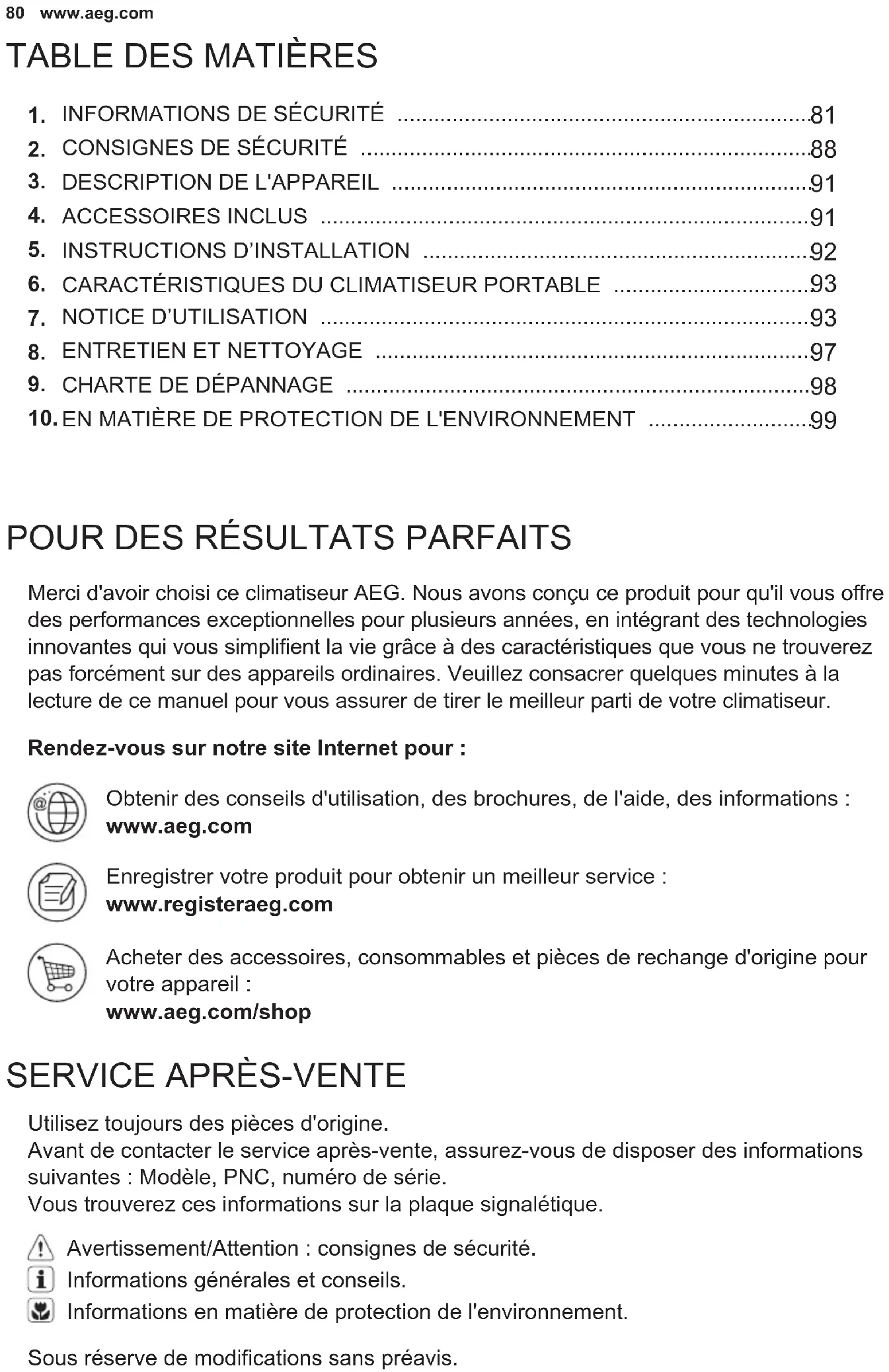 Merci d'avoir choisi ce climatiseur AEG. Nous avons conçu ce produit pour qu'il vous offre des performances exceptionnelles pour plusieurs années, en intégrant des technologies innovantes qui vous simplifient la vie grâce à des caractéristiques que vous ne trouverez pas forcément sur des appareils ordinaires. Veuillez consacrer quelques minutes à la lecture de ce manuel pour vous assurer de tirer le meilleur parti de votre climatiseur. Utilisez toujours des pièces d'origine. Avant de contacter le service après-vente, assurez-vous de disposer des informations suivantes : Modèle, PNC, numéro de série. Vous trouverez ces informations sur la plaque signalétique. Rendez-vous sur notre site Internet pour : Obtenir des conseils d'utilisation, des brochures, de l'aide, des informations : www.aeg.com Enregistrer votre produit pour obtenir un meilleur service : www.registeraeg.com Acheter des accessoires, consommables et pièces de rechange d'origine pour votre appareil : www.aeg.com/shop